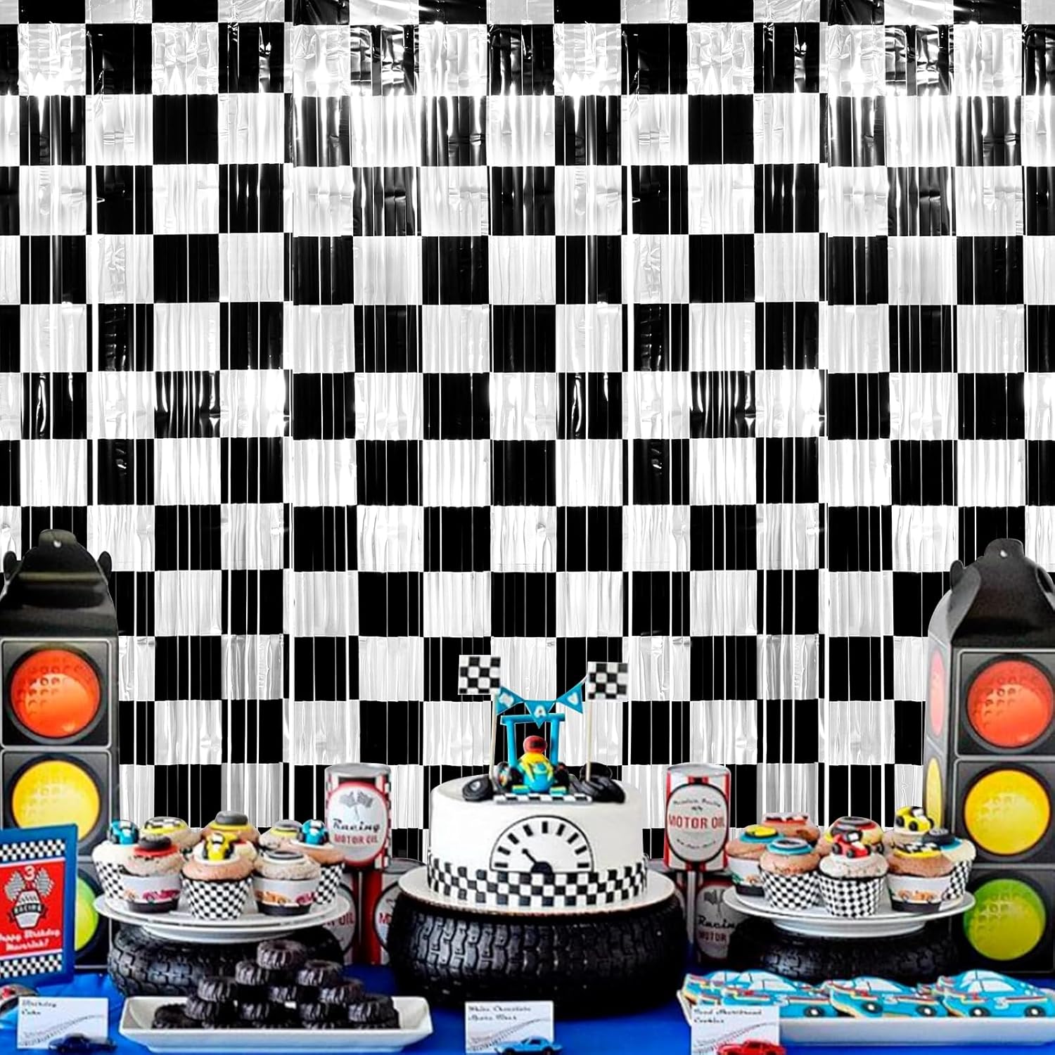 3 Pack 3.3Ft x 6.6Ft Race Car Checkered Foil Fringe Curtain Backdrop Decorations, Black White Metallic Tinsel Foil Streamers Curtain Photo Booth for Race Car One Happy Dude Birthday Party Decorations