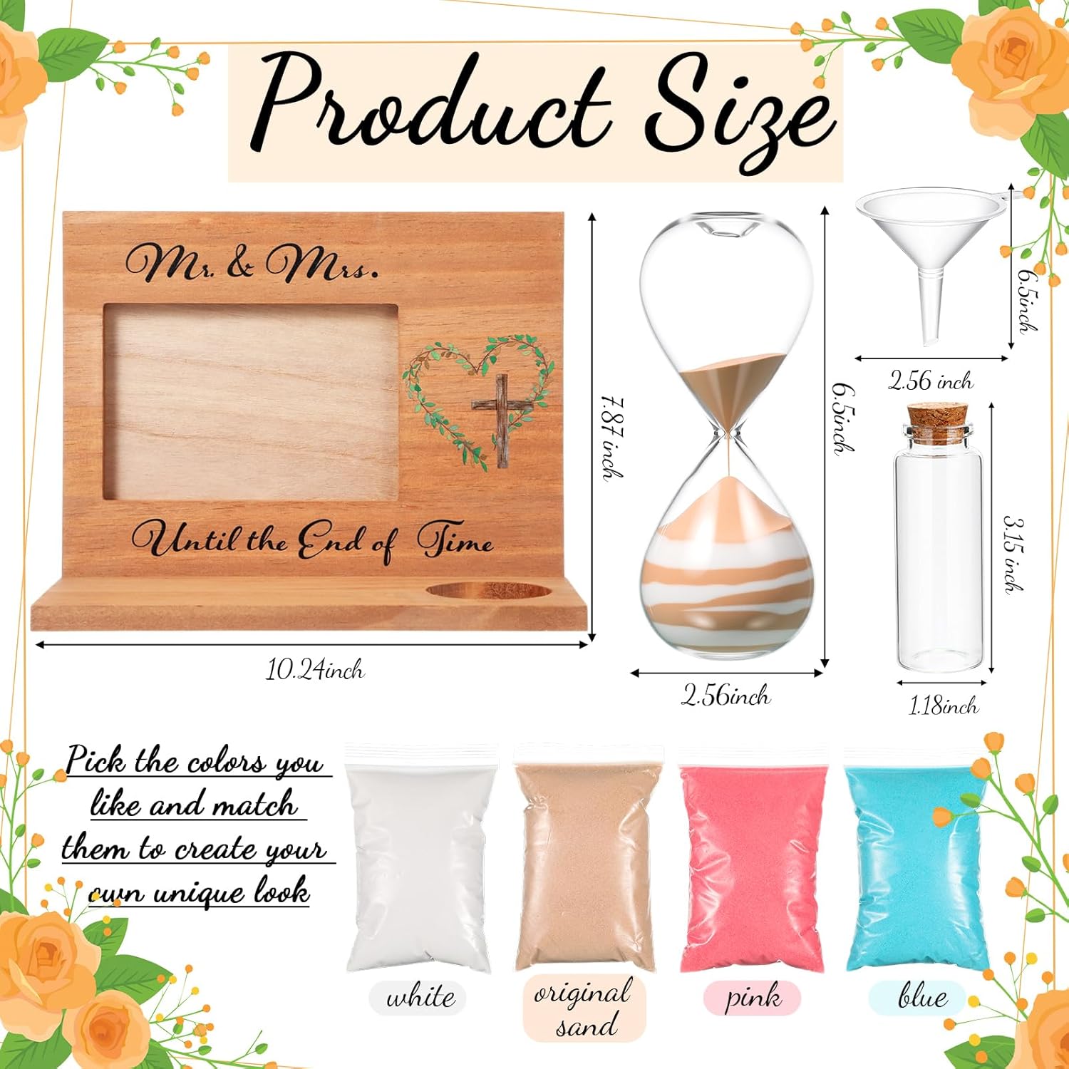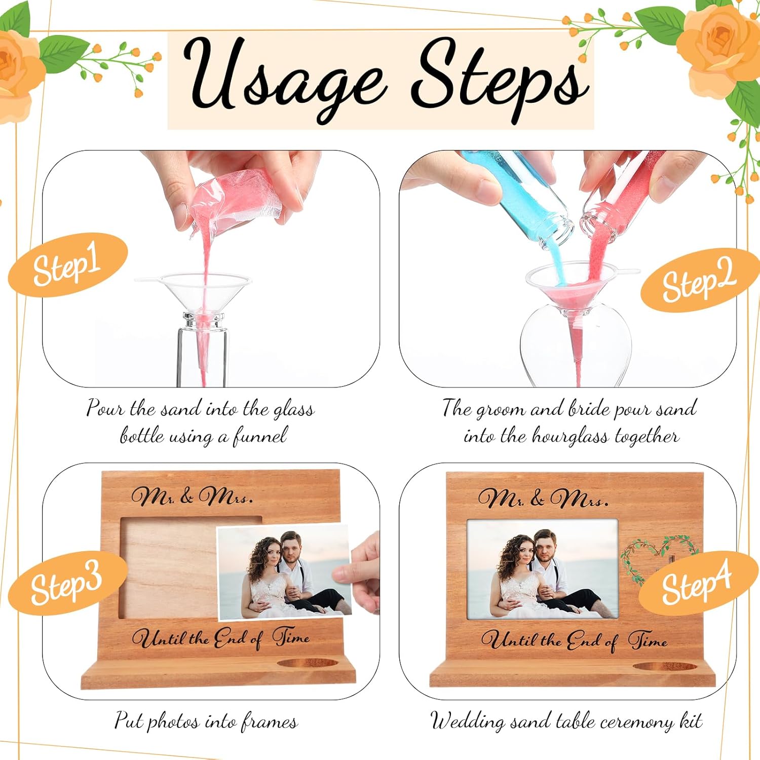 • Package Contents: You will receive 1 piece of wedding photo frame with wooden base, 1 piece of hourglass, 1 piece of plastic funnel, 2 pieces of empty glass bottles, 4 bags sand in pink, blue, white and original color, includes everything needed for an elegant wedding unity sand ceremony. The four colors can be matched with each other to create a color that is special to you, while add a layer of sophistication and uniqueness to your special day