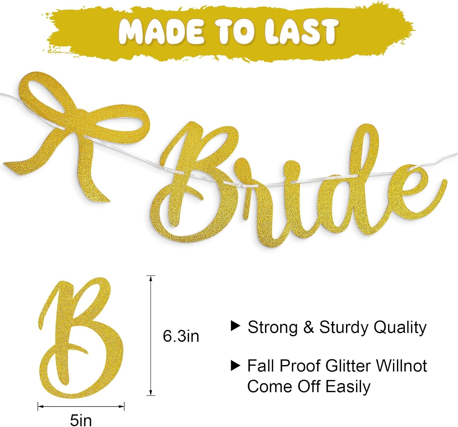 • Bridal Banner Set: This gold bride to be banner set features 9 glittery letters spelling “Bride to Be” along with 2 bow cutouts on each end, each flag measures 5in x 6.3in, bringing a lively, festive vibe to your decor. The elegant shine and trendy hues create a stylish backdrop that’s perfect for capturing unforgettable moments at your bridal shower party decoration and bachelorette party celebration.