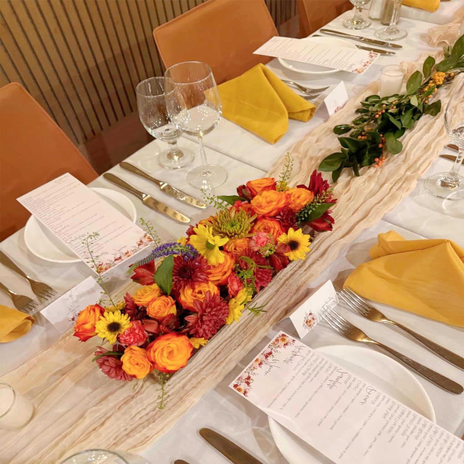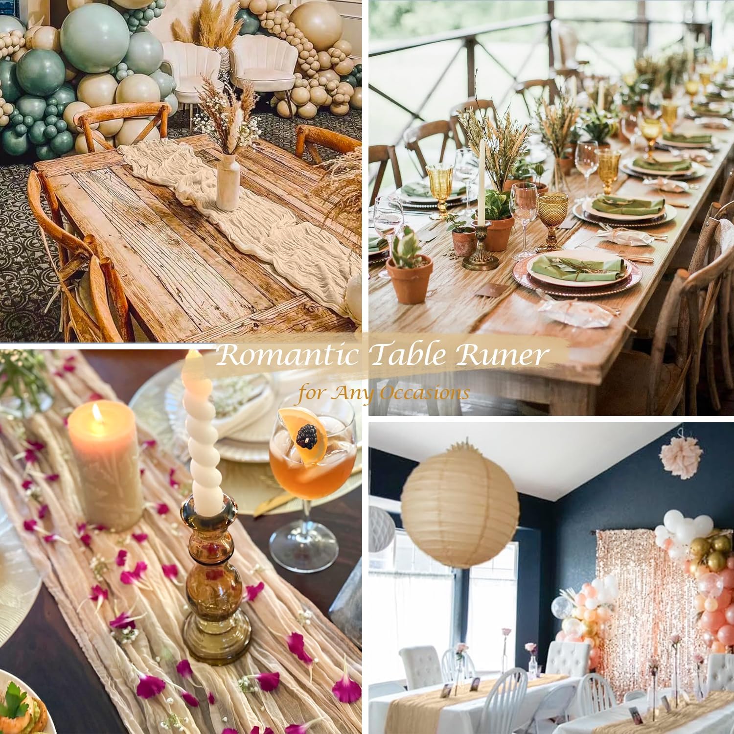 • 🥂【Reusable & Soft】These romantic beige table runner is made of premium cheese gauze fabric with beautiful crinkling. Soft feeling, reusable, washable and fade resistant. These cheesecloth table runner champagne adopt unique pleated workmanship, adding a touch of romantic and elegant to your events. The boho wedding table runner is sheer, natural drape, lightweight and skin-friendly. Soft table linen with gorgeous finished edges drapes gracefully across your banquet table, adds to romantic, delicate, and flowy vibe.