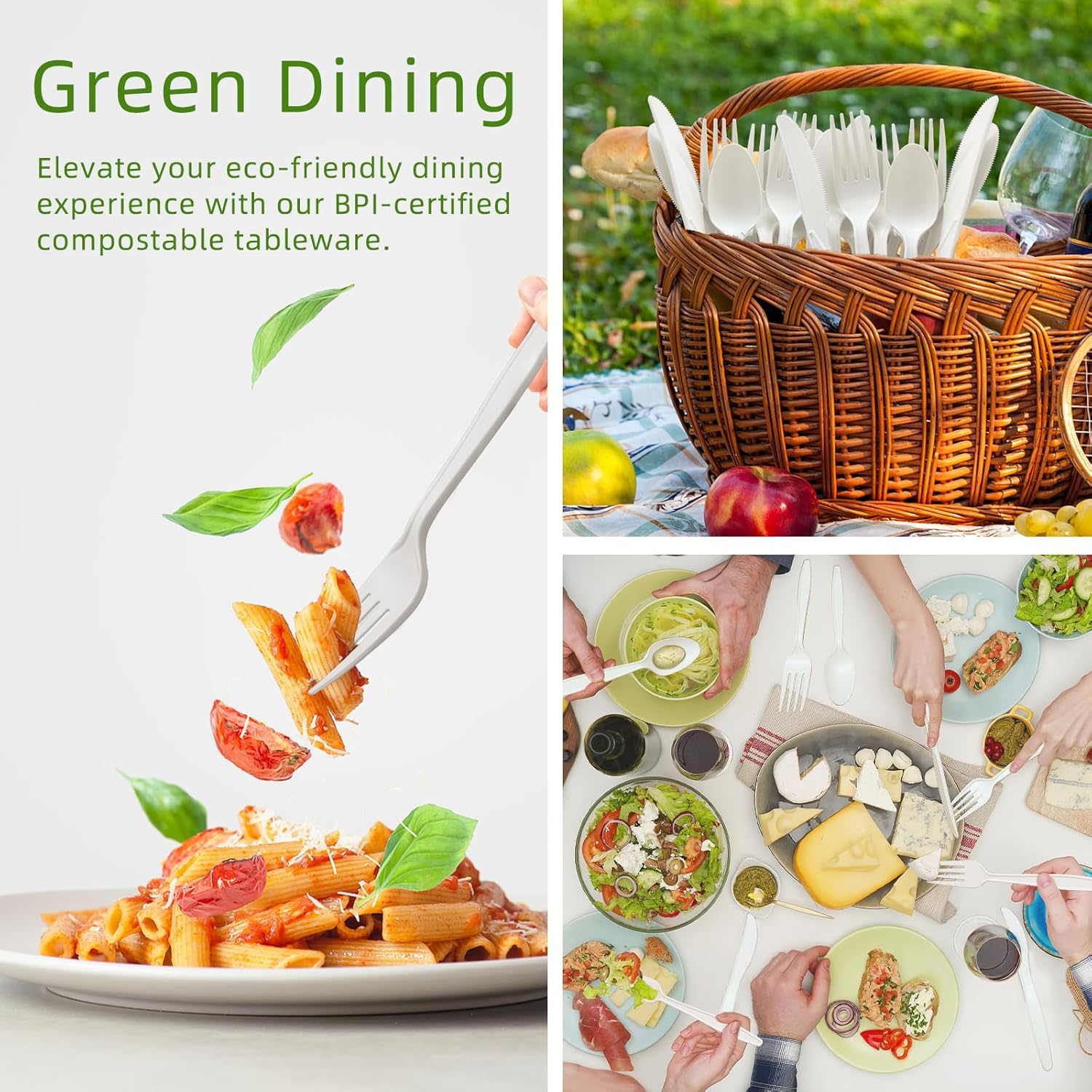 • 【Thickened Design & High-Temperature Resistance】The compostable silverware feature a thickened structure and reinforced blade tips, providing exceptional strength to withstand hard foods (meat, pasta, peanut butter) without bending or breaking. The compostable utensils have high-temperature resistance (-4°F to 212°F), making them suitable for hot soup and hot meals.