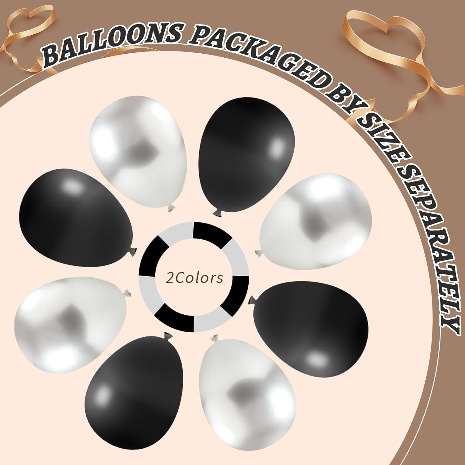 • Package List :Black and Silver Balloons Garland Arch Kit includes 18" Black /metallic Silver balloons(12 pcs), 12" Black /metallic Silver balloons(100 pcs), 10"Black /metallic Silver balloons (100 pcs), 5" Black /metallic Silver balloons(100pcs),glue dotsx200, ribbonx2, decorative stripx2. plenty in quantity, Perfect for balloon arch kit and black and silver birthday decorations