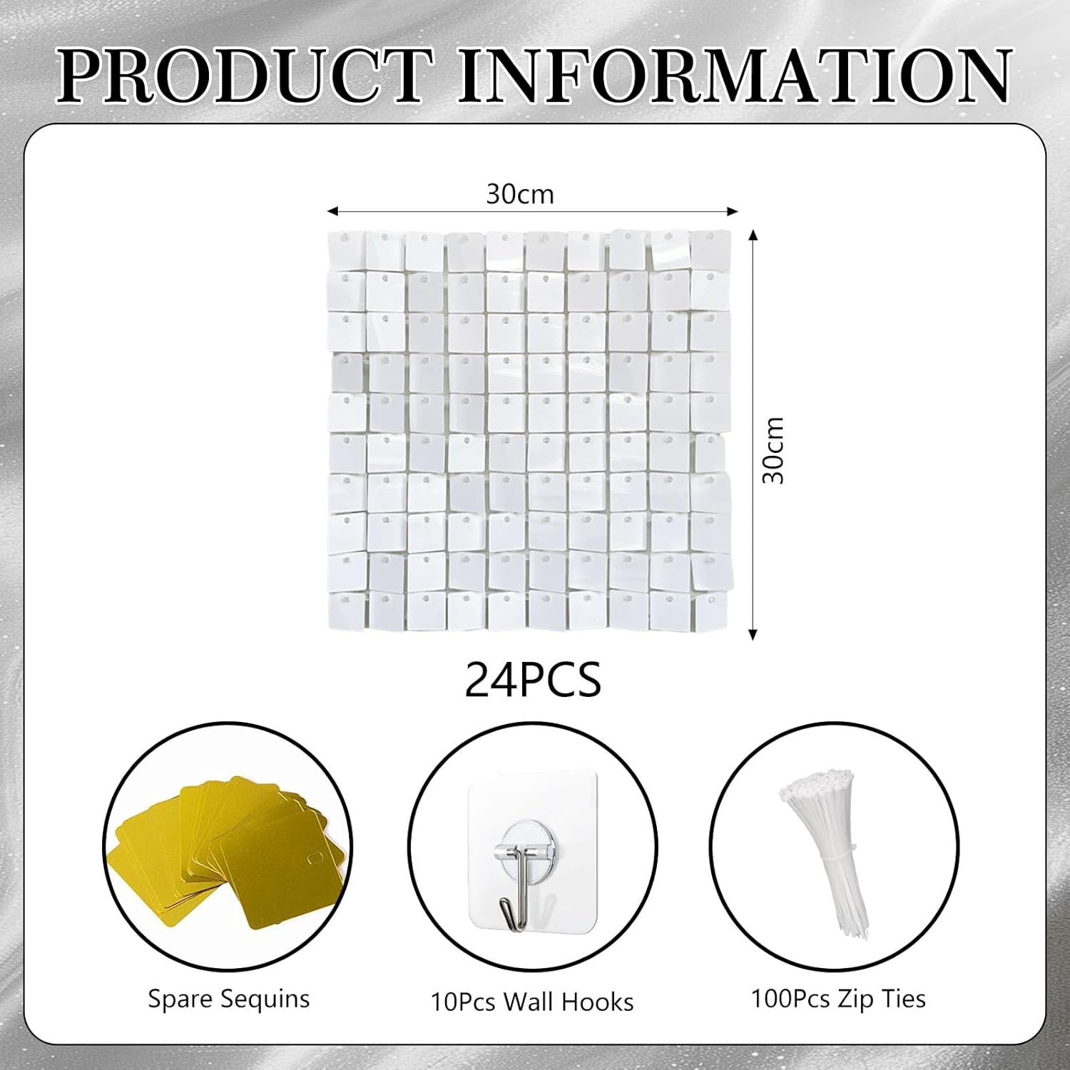 • 【Package Includes】Each box includes 24 white wall panels (12"x 12" each). We provide enough zip ties (100 pcs), a pack of spare sequins, and wall hooks (10 pcs) to support the weight of the wind panel, as well as an installation manual. 24pcs can cover 4x6ft place. More boxs will cover a larger area and have a fuller look.