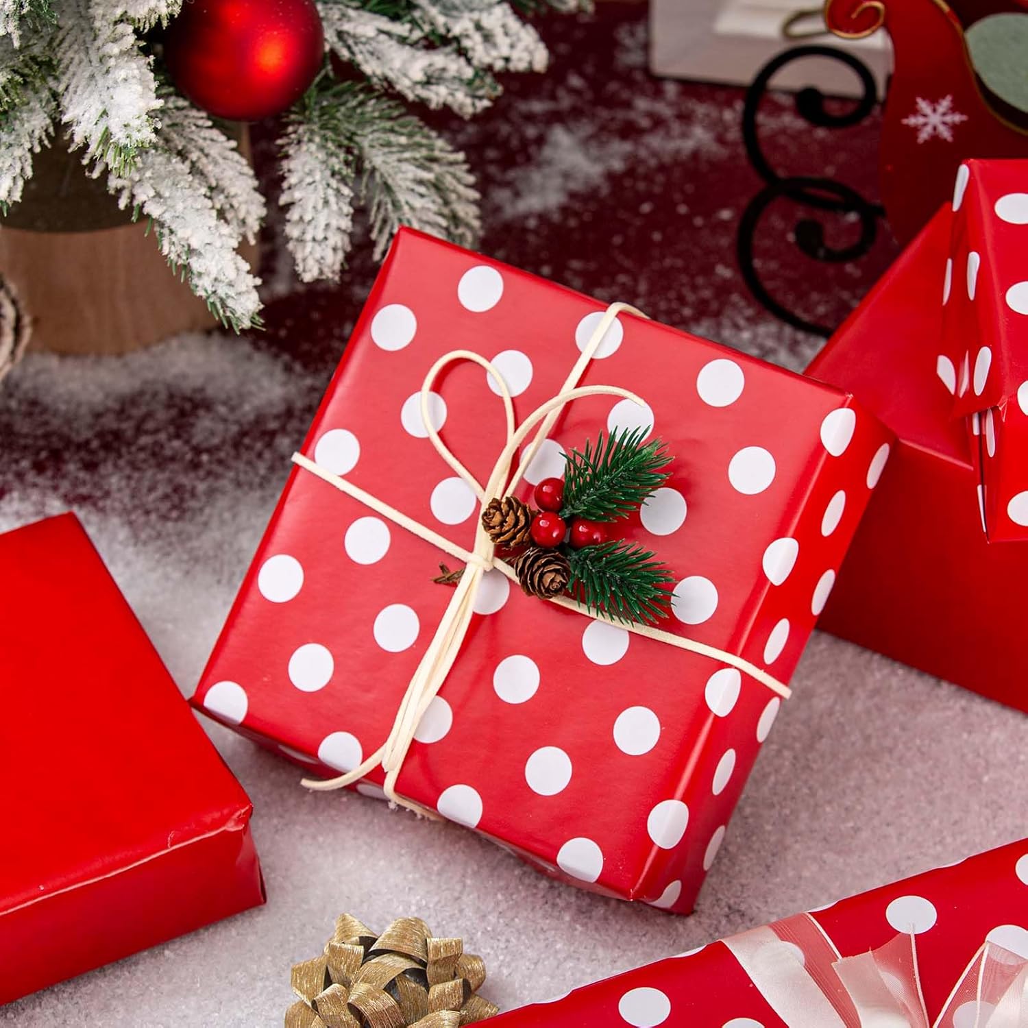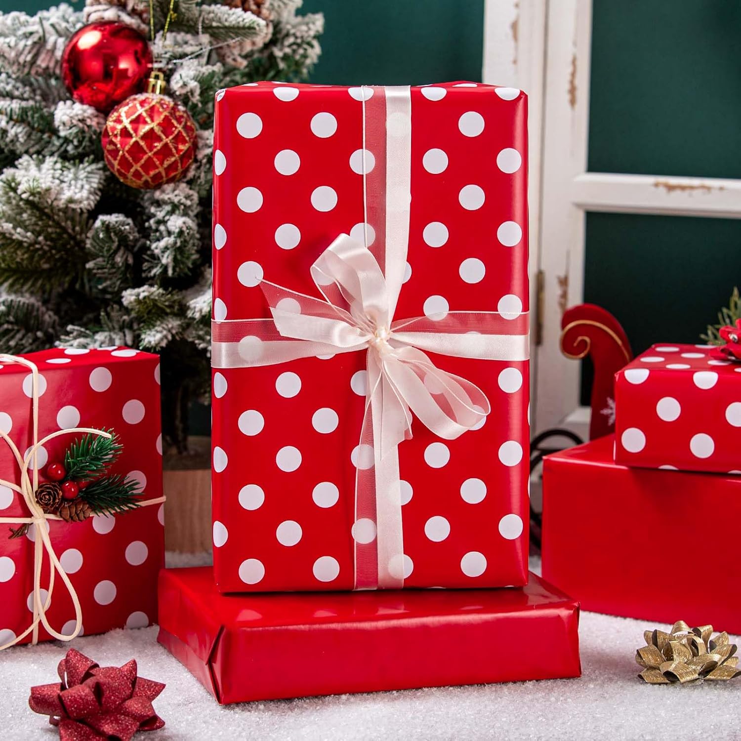 • Double-Sided Wrapping Paper: One side has red and white polka dots, and the other is solid pink, making your gift wrap both fun and elegant