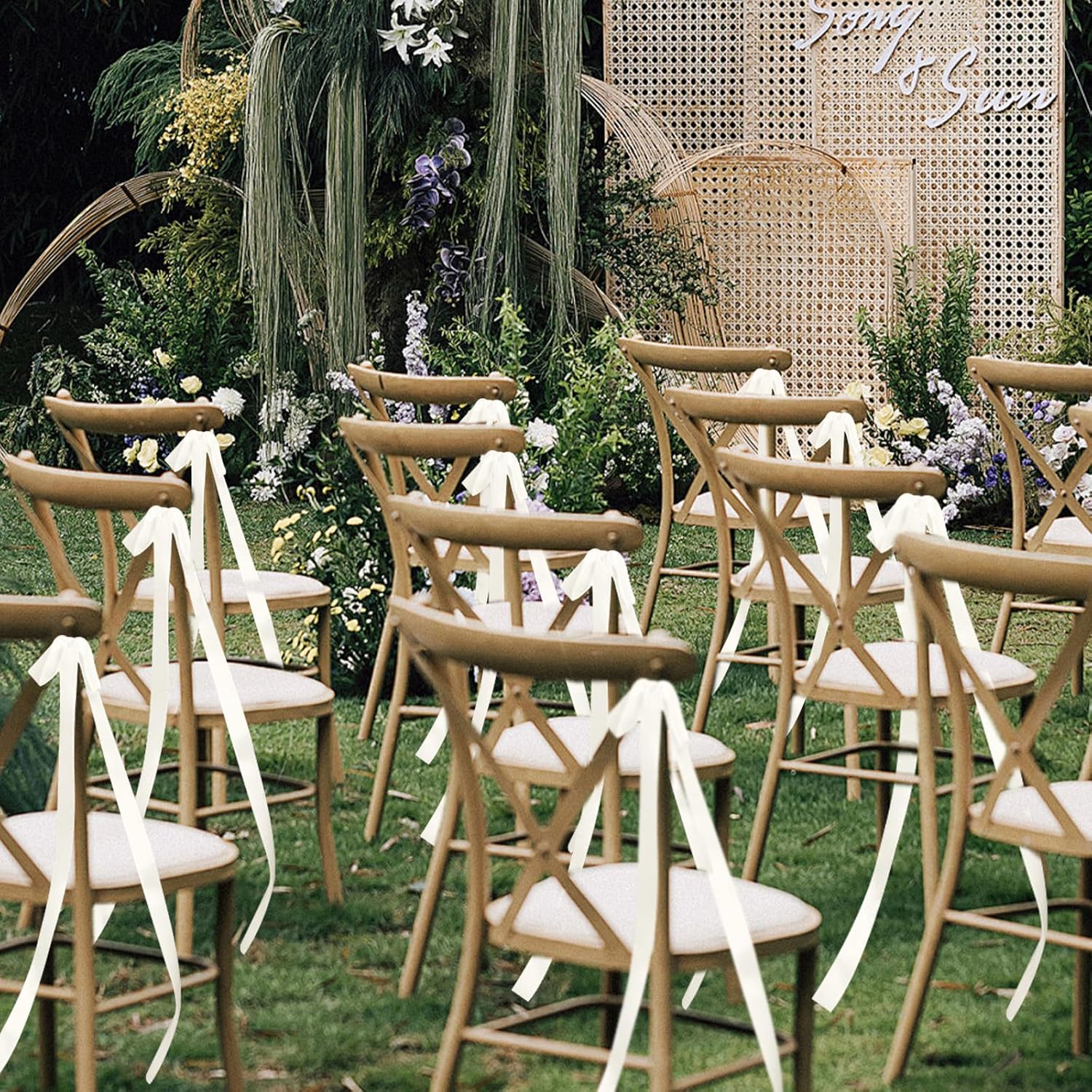 • Lightweight yet luxurious: these delicate chair bows sway gently with every breeze, weaving a dreamy atmosphere into your special day. Made from high-quality ribbon, they combine ethereal beauty with lasting resilience, adding a whisper of romance to weddings or elegant gatherings.