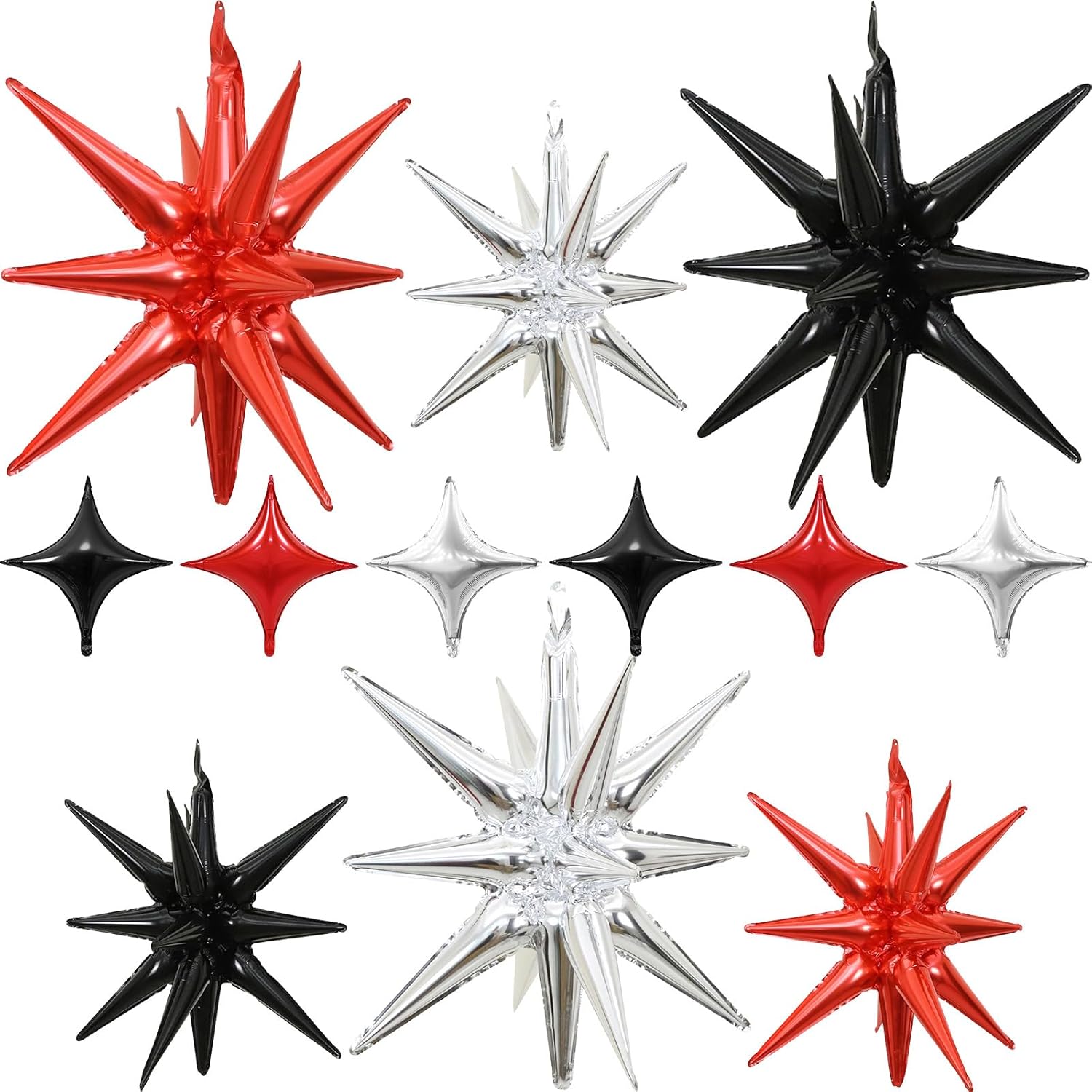 Black Red Silver Star Balloons 12pcs, 27/22 Foil Inch Star Explosion Balloons, Large Spike Mylar Cone Balloon, Fireworks Shape Balloon Decor for New Year Casino Night Racing Car Theme Prom