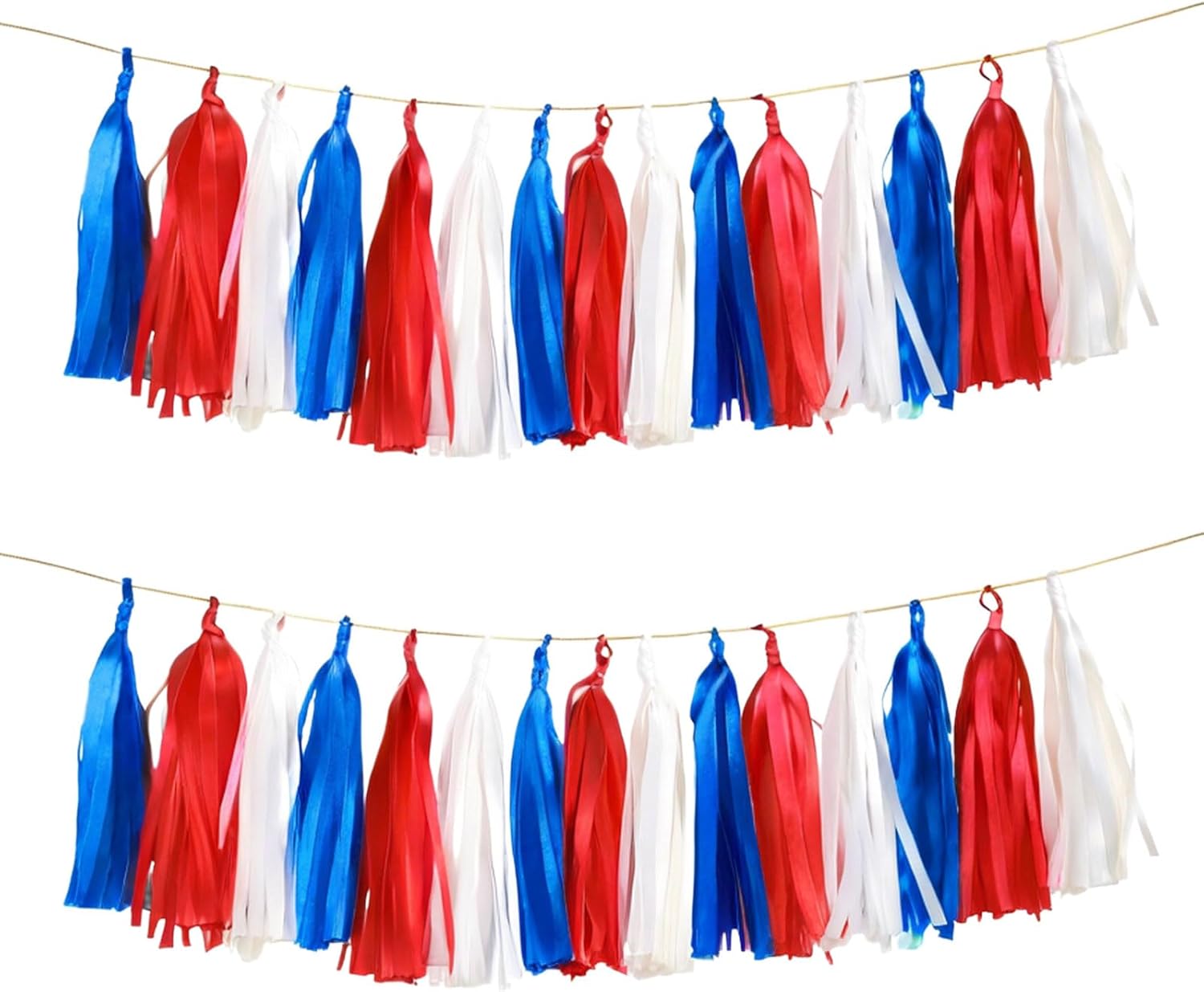 • PACKAGE CONTENTS: Set of 15 tissue paper tassels in red, navy, white๏ผŒa 2 meterst twine for easy hanging and instant decoration