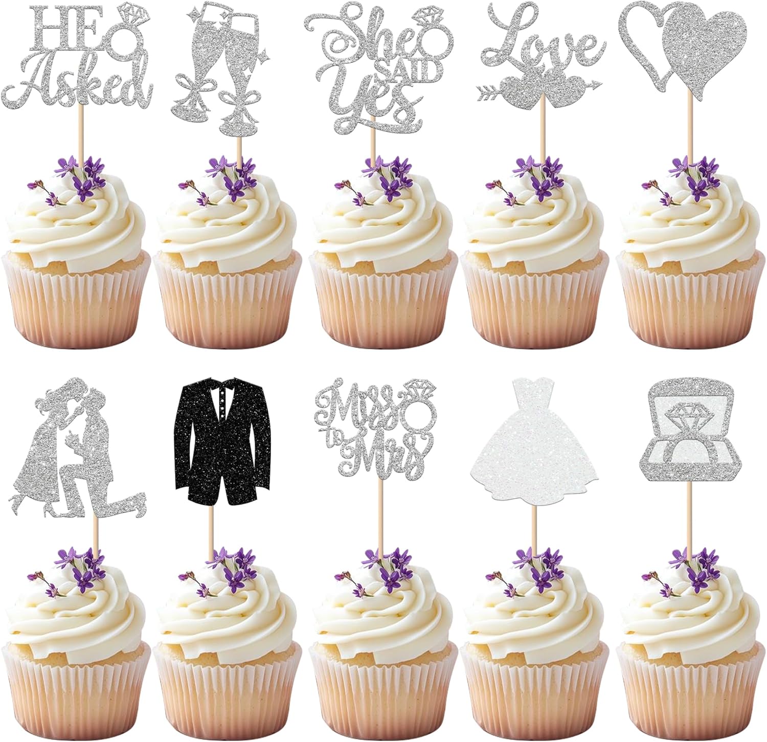30 Pack Bride to be Cupcake Toppers Glitter Diamond Ring I Do Love Cupcake Picks Miss to Mrs He Asked She Said Yes Bridal Shower Wedding Engagement Bachelorette Cake Decorations Silver