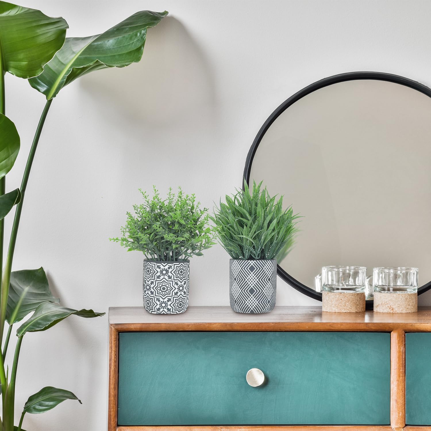 • Durable Material with Fashionable Style: Made of premium plastic, these small fake plants won’t wither or fade. Featuring a sleek geometric pattern and a cement ceramic texture, this planter effortlessly blends modern minimalism with natural charm. Ideal for enhancing Scandinavian, industrial, or boho-style interiors.Please Note: The ceramic pots are fragile β€” handle with care
