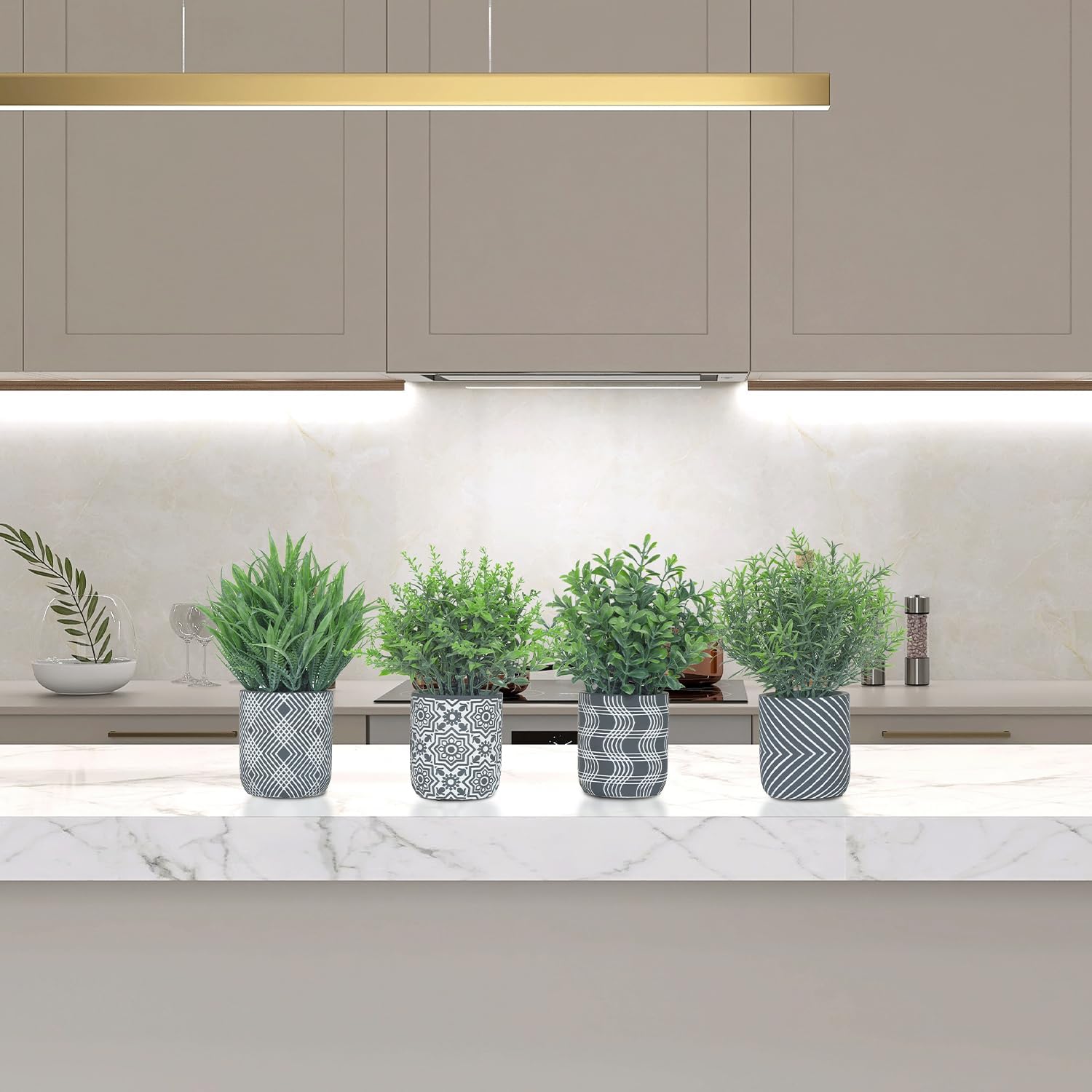 • Small Size & Adjustable Shape: Includes 4 artificial plants (grass, rosemary, boxwood, lavender), each approx. 9"H & 5.5"W. Patterned cement pots (3.1"W x 3.5"H). Gently adjust leaves for desired shape. You can gently adjust the leaves to achieve your desired shape and fullness. NOTE: The leaves may be slightly compressed during shipping β€” simply reshape them by hand to restore their natural appearance