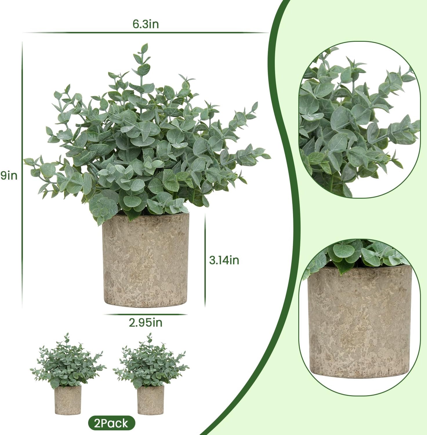 • Small Size & Adjustable Shape: This set includes 2 small artificial eucalyptus plants, each measuring approximately 9 inches in total height (from the top of the plant to the bottom of the pot) and 6.3 inches in width when the leaves are fully spread. The gray paper pulp pots are about 2.95 inches wide and 3.1 inches tall. You can gently adjust the leaves to achieve your desired shape and fullness. NOTE: The leaves may be slightly compressed during shipping β€” simply reshape them by hand to restore their natural appearance