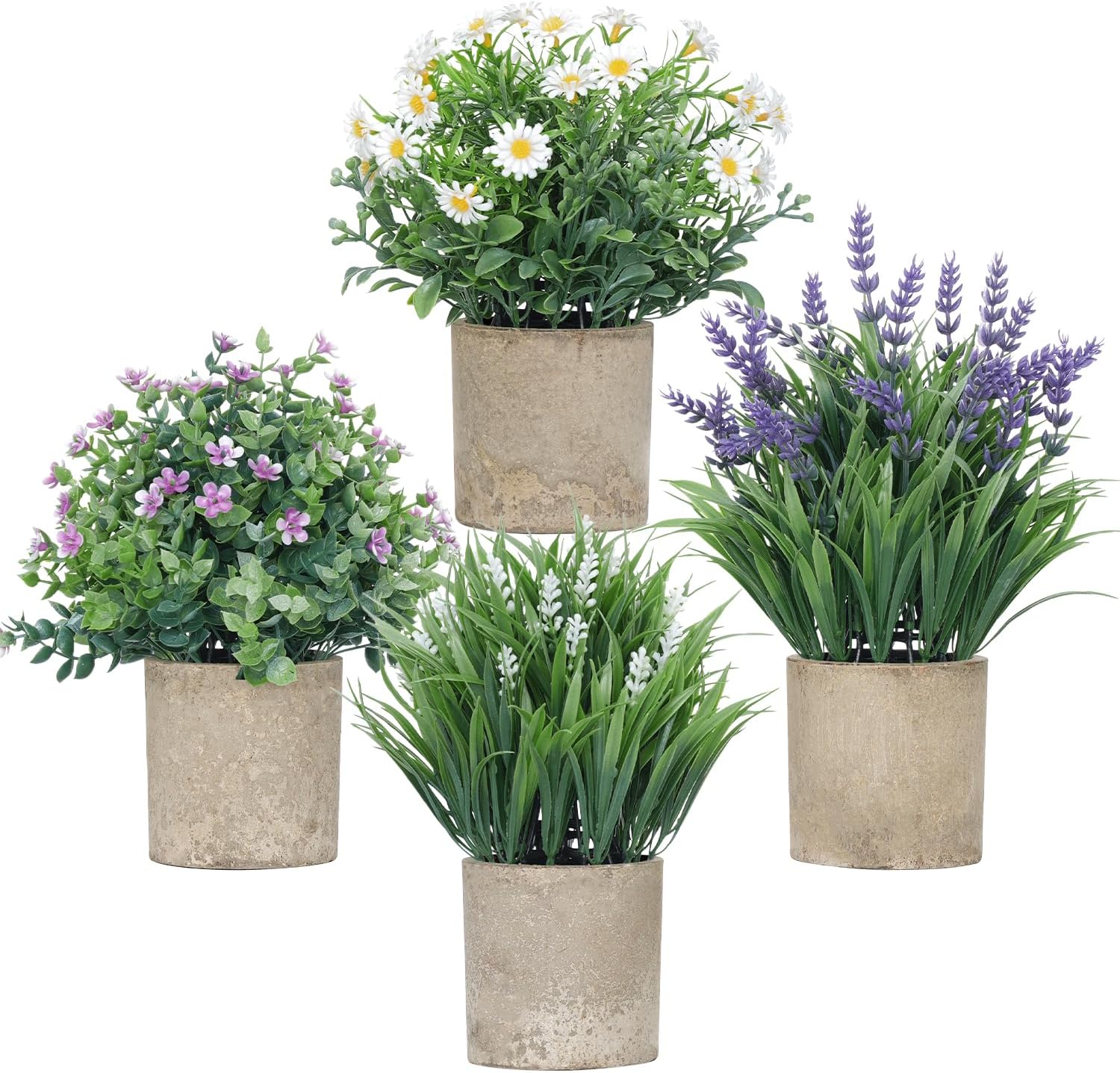 • Small Size & Adjustable Shape: This set includes 4 small artificial plants: a eucalyptus plant with flowers, a purple lavender, a white lavender, and a white daisy. The purple lavender measures 10.6 inches in total height, while the other three plants stand approximately 9 inches tall (from the top of the plant to the bottom of the pot). All plants span about 5.9 inches in width when the leaves are fully spread. The gray paper pulp pots are about 2.95 inches wide and 3.1 inches tall. You can gently adjust the leaves to achieve your desired shape and fullness. NOTE: The leaves may be slightly compressed during shipping β€” simply reshape