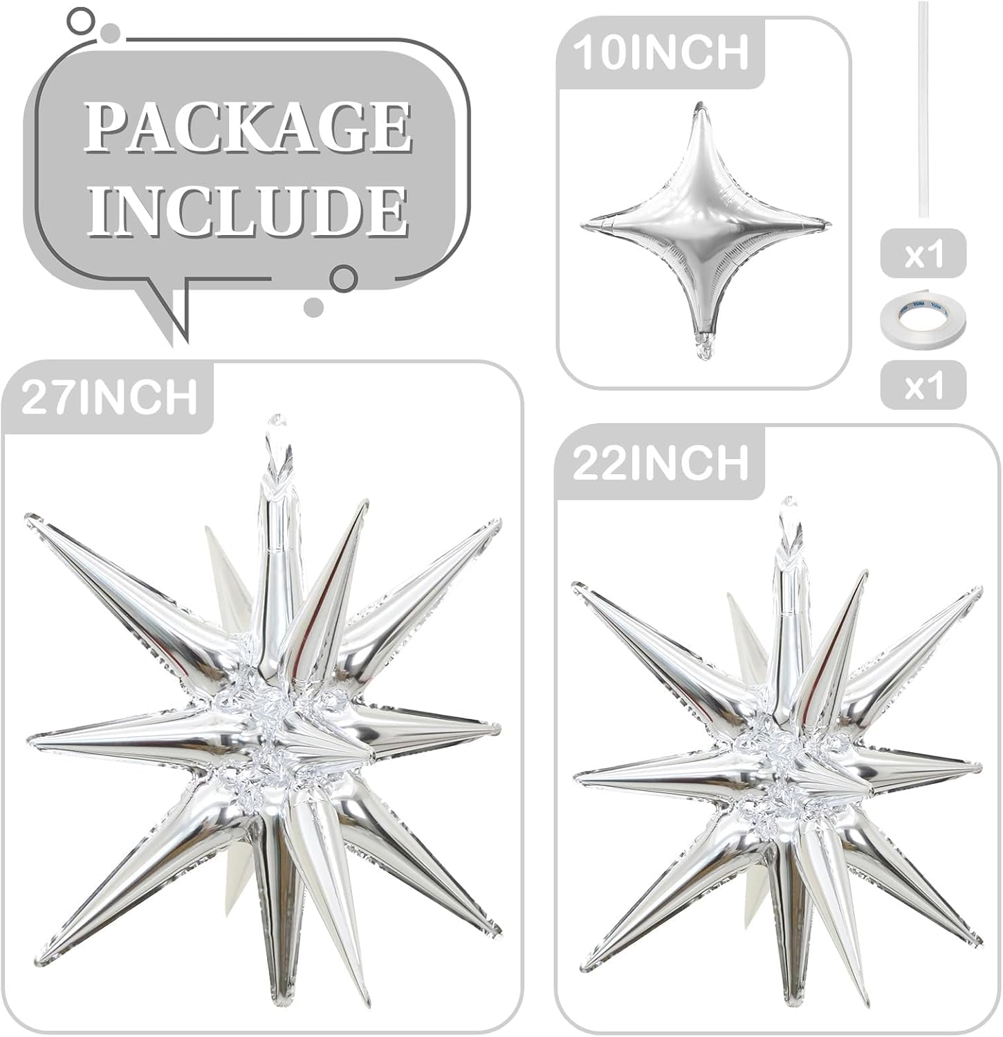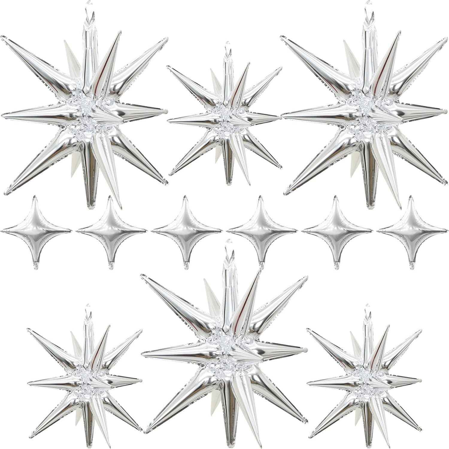Silver Star Balloons 12pcs, 27/22 Inch Foil Star Explosion Balloons, Large Spike Mylar Cone Balloon, Fireworks Shape Balloon for Bachelorette Anniversary New Year Graduation Birthday