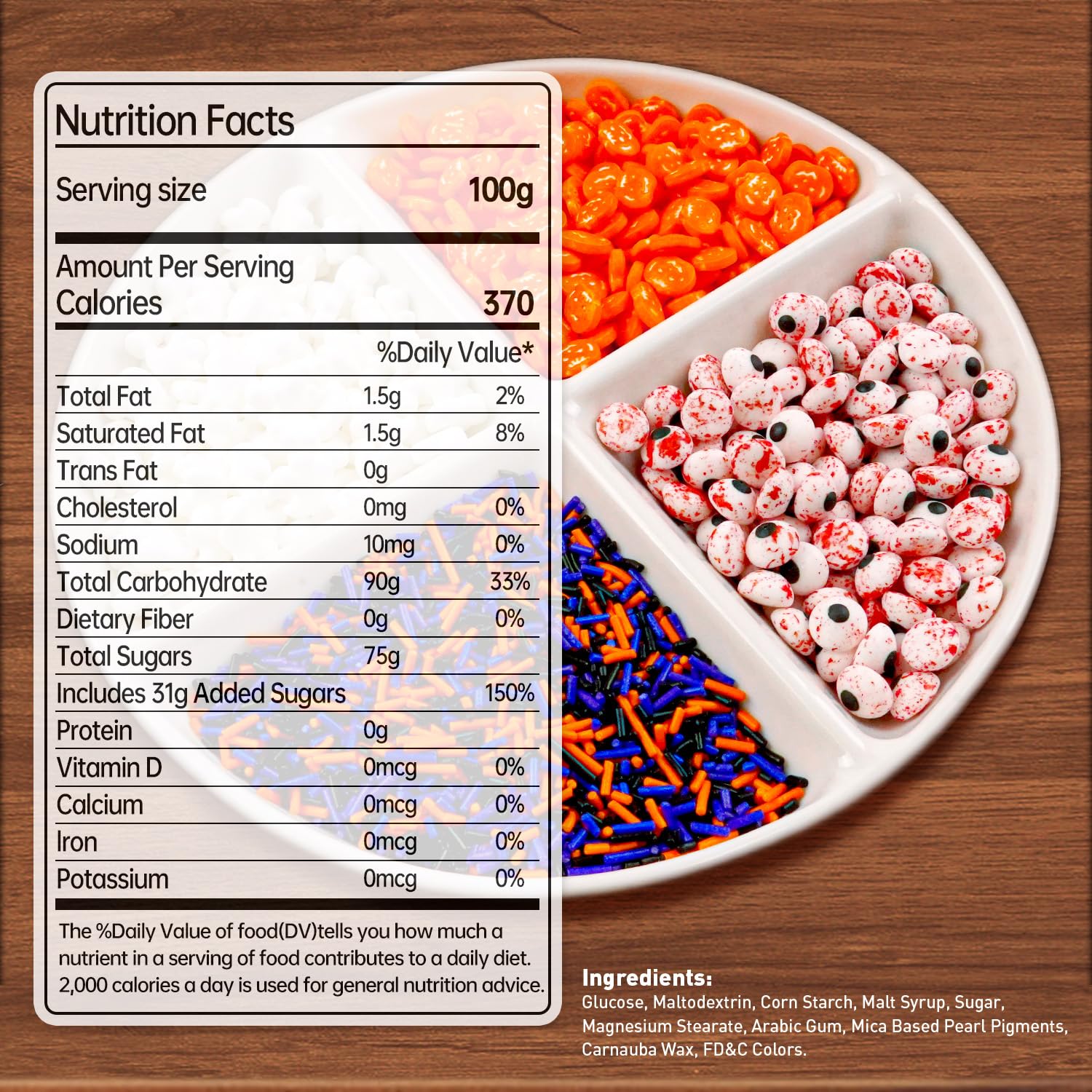 • [4 kinds of patterns] This product include 4 kinds of Halloween sprinkles, each with different patterns, containing orange Pumpkin、white ghost、bloody eyeballs、colorful jimmies, let your cupcake and donut bring you variable surprise.