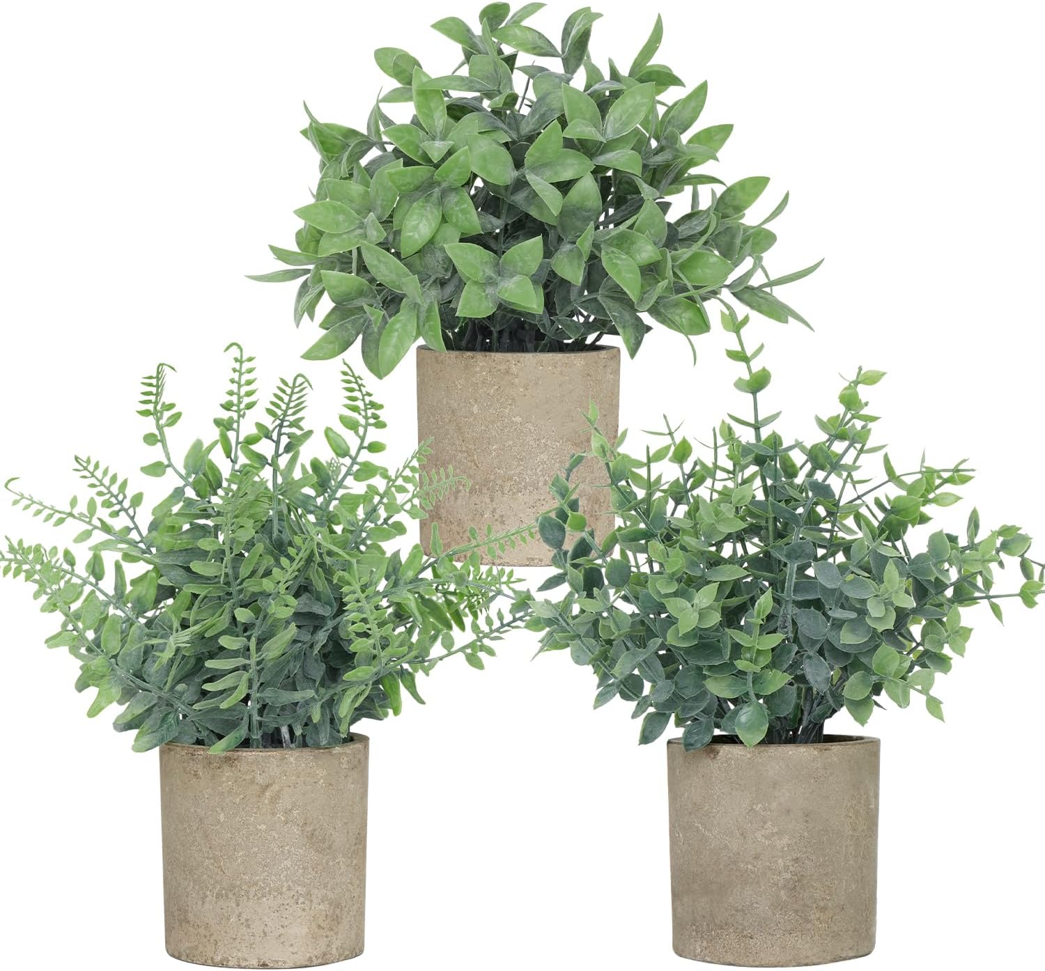 • Small Size & Adjustable Shape: This set includes 3 small green artificial plants: a eucalyptus, a Boston fern, and a boxwood. Each measuring approximately 9.4 inches in total height (from the top of the plant to the bottom of the pot) and 5.9 inches in width when the leaves are fully spread. The gray paper pulp pots are about 2.95 inches wide and 3.1 inches tall. You can gently adjust the leaves to achieve your desired shape and fullness. NOTE: The leaves may be slightly compressed during shipping β€” simply reshape them by hand to restore their natural appearance