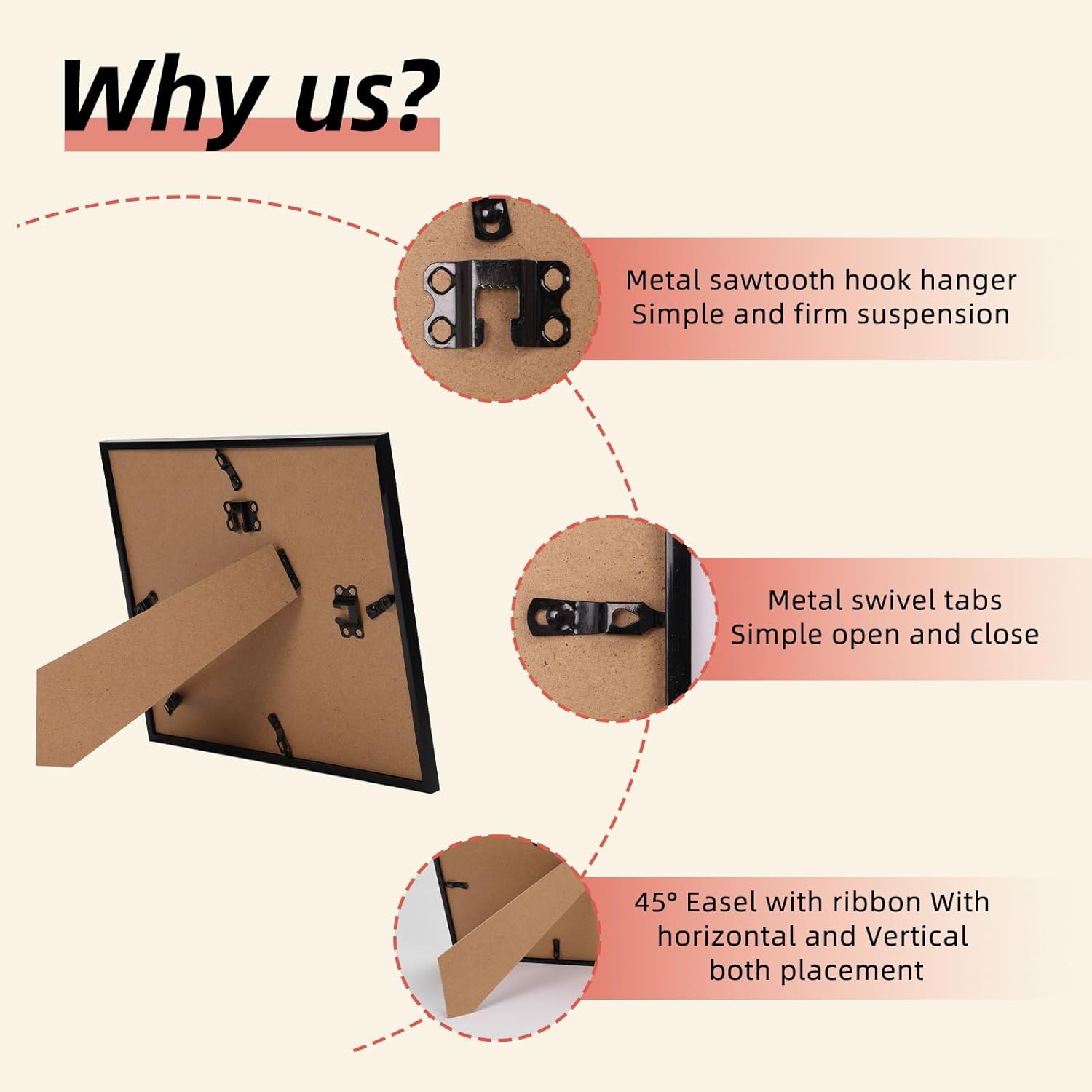• Effortless Setup & Display: Each 8.5x11 photo frame features 4 secure snap-tabs for easy loading. The frames include both a kickstand for tabletop use and a pre-installed hanger for walls. Display your documents horizontally or vertically in seconds.