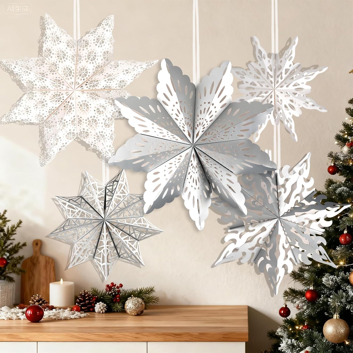 • Unique Snowflake Designs: This Christmas paper snowflake lanterns set includes 5pcs led lights and a remote control,3pcs silver paper snowflake lanterns, 2pcs white paper snowflake lanterns, each beautifully crafted with intricate hollow out cutout designs. Measuring 14 to 18 inches, these eye-catching hanging christmas decorations add a magical winter touch to your holiday dĂ©cor