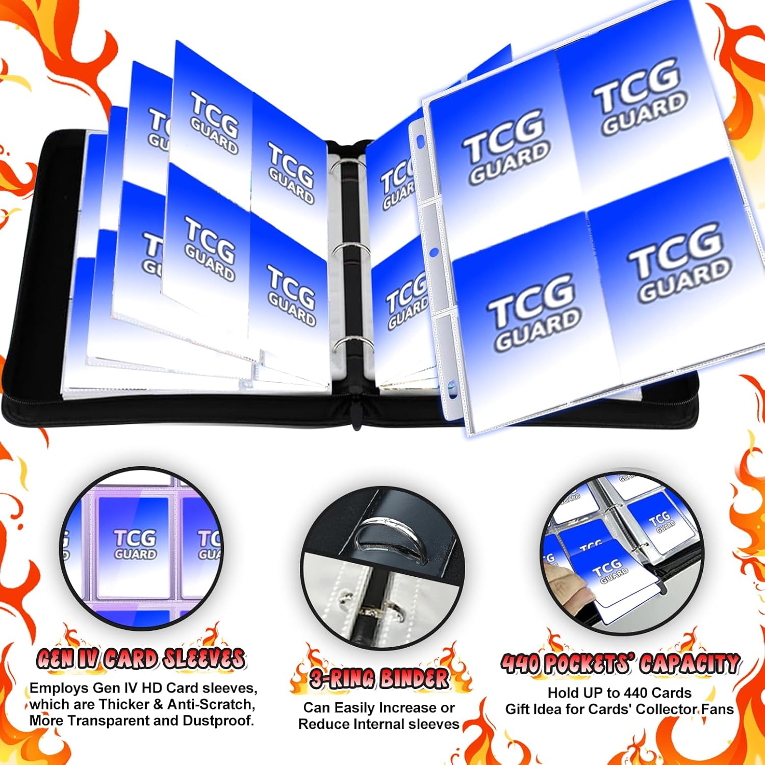 440 Card Binder 4 Pocket, 3-Ring Trading Card Binder with 55 Page Removable Sleeves, High Storage Waterproof Trading Card Holder Collection Card Album Carrying Organizer Case for MTG TCG Cards -Fire