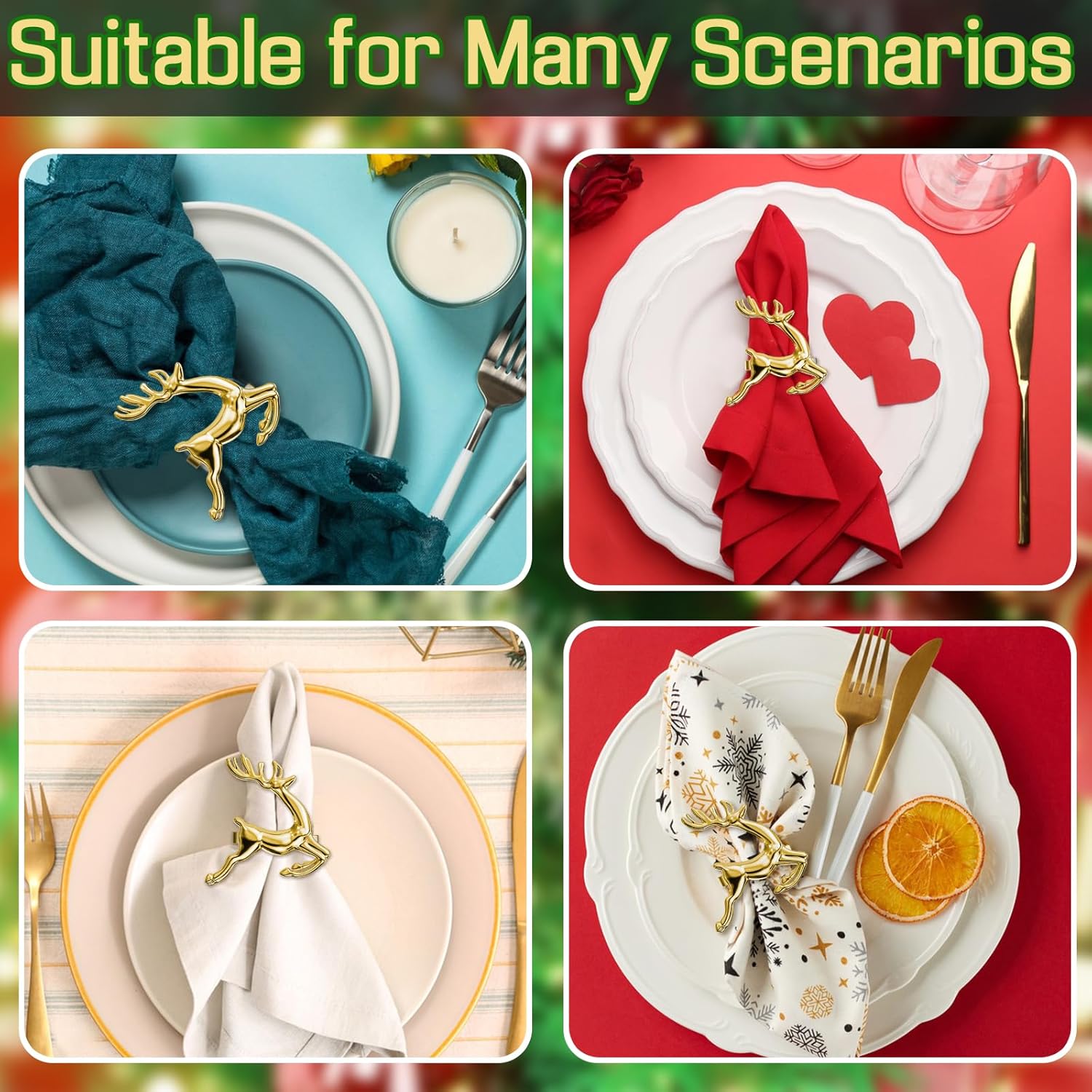 • Santa Bling Napkin Rings: You will receive gold deer napkins rings set of 24, simple and elegant, delicate and romantic, suitable for Christmas napkins cloth of different colors and materials. The reindeer Christmas decoration napkins rings could add more festive atmosphere to your Christmas table decorations for dinner party and become a highlight