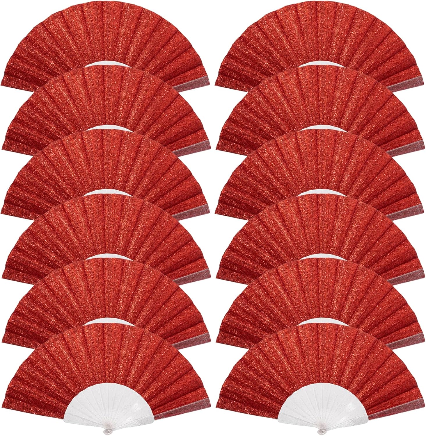 12 Pack Handheld Fan,Folding Hand Glitter Fan with Shining Transparent Fan Rib – Ideal for Wedding, Church, Festival, Dance, Tea Party, Club, and EDM Accessories, Red