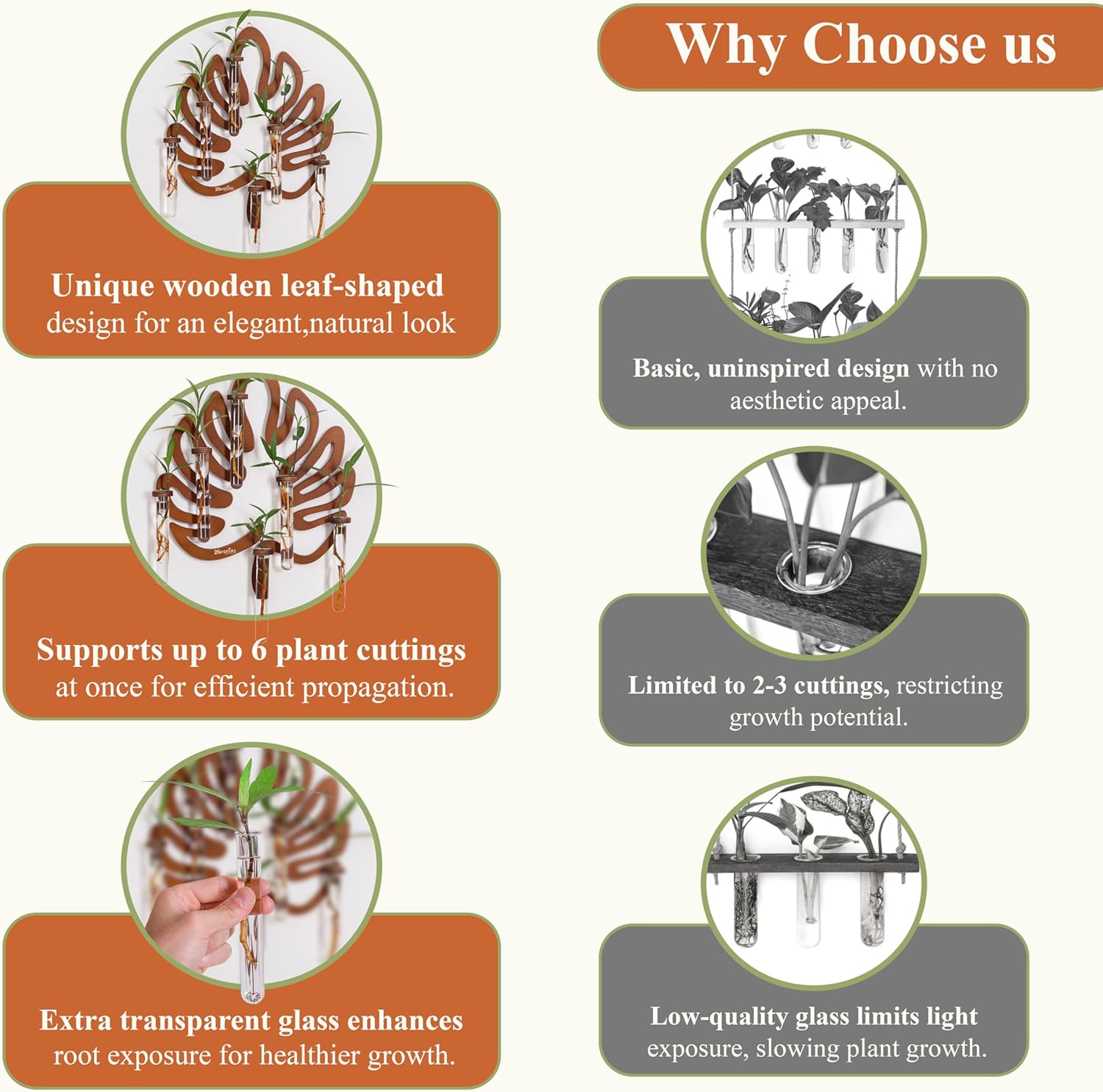 • Enhanced Growth โ€“ Grow up to 6 cuttings at once with our hanging wall planter. It provides better light exposure for root development, designed with extra-transparent propagation tubes, promoting healthier growth for your plants. The spacious test tubes allow plant cuttings to thrive, making propagation easier and more efficient.
