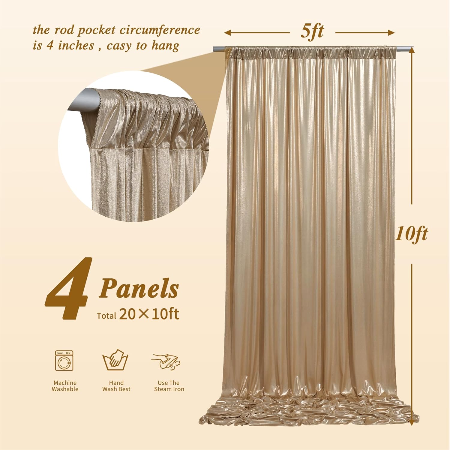 • Sequin Backdrop Curtain: 4 Panels 5FT Width By 10FT Height Sequin Backdrop with a 4-inch rod pocket on the top for easy hanging.
