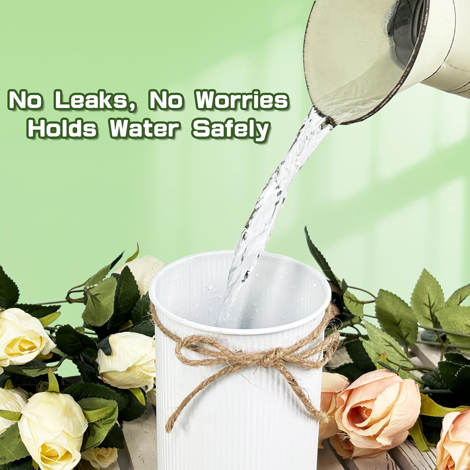 6" High Farmhouse Vases for Centerpiece, Rustic Mason Jars with Twine Bow for Flowers, Vintage Galvanized Metal Vase Tin Bucket for Wedding Home Decor (White, 2Pcs)