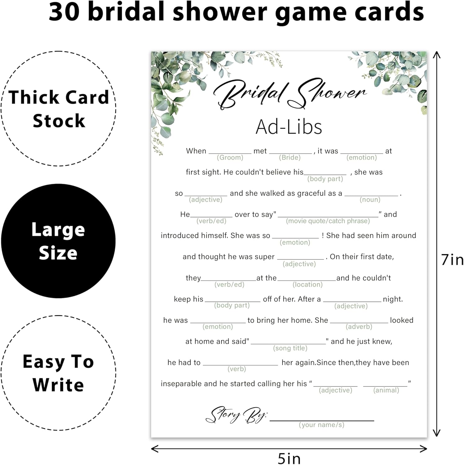 Eucalyptus Bridal Shower Game Cards - Ad-libs Game, Wedding Engagement Bachelorette Party Bridal Shower Games for 30 Guests, Double Sided Cards Set of 30, Activity Supplies & Favor/A03