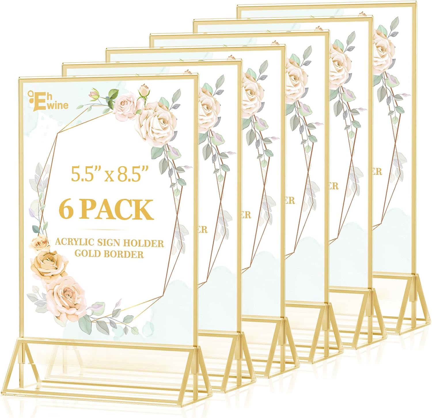 EHWINE 6 Pack Acrylic Sign Holder 5.5 x 8.5, Double Sided Gold Picture Frame Stand up Table Top Sign Holders, Clear Display Stand Menu Flyer Holder for Wedding Party