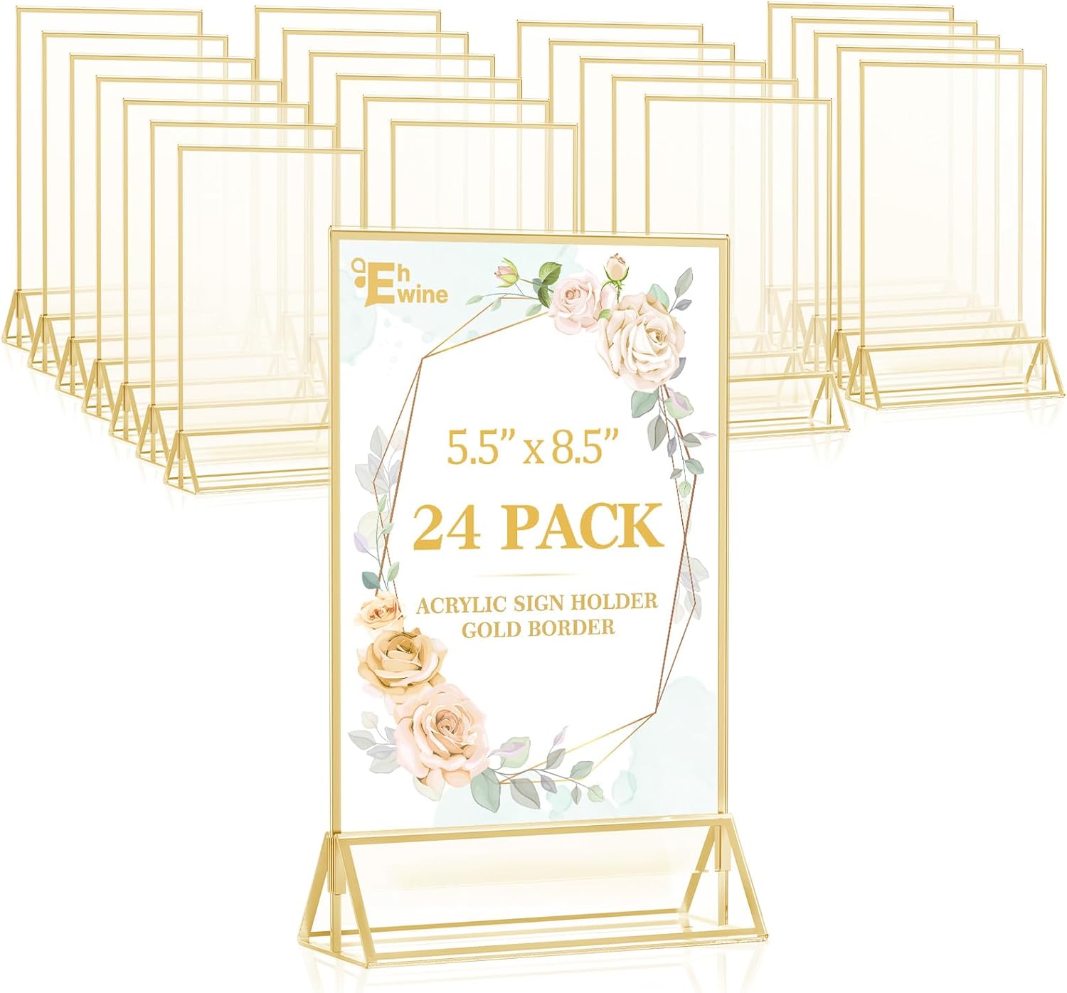 EHWINE 24 Pack Acrylic Sign Holder 5.5 x 8.5, Double Sided Gold Picture Frame Stand up Table Top Sign Holders, Clear Display Stand Menu Flyer Holder for Wedding Party