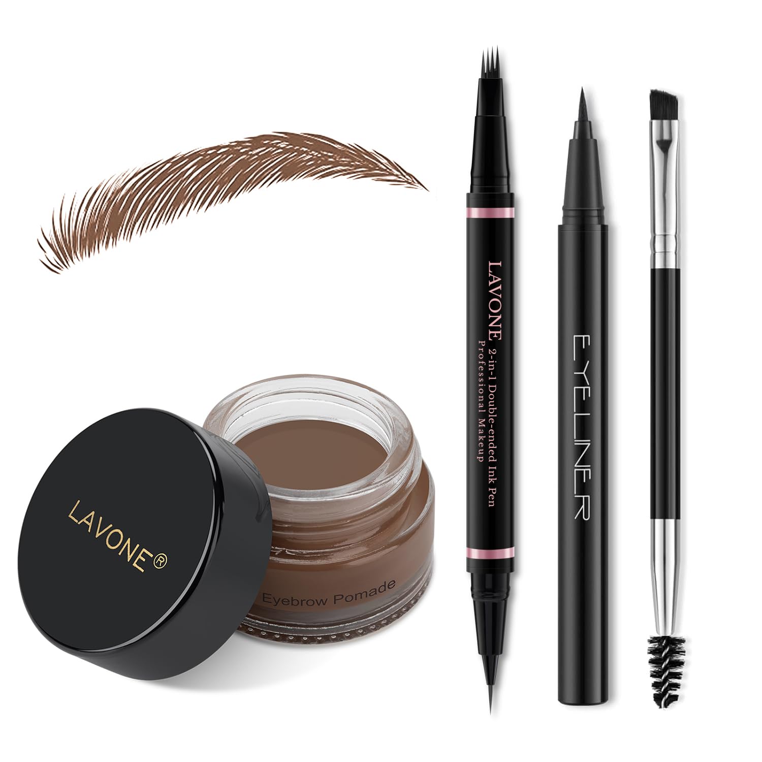 • 【What You Can Get】: LAVONE brow pen make up eyebrow kit includes brow pencil (color: brunette), brow pomade (color: brunette), eyeliner (color: black) and dual-ended eyebrow brush. The microblading brow pencil kit with a zipper pouch for on the go.