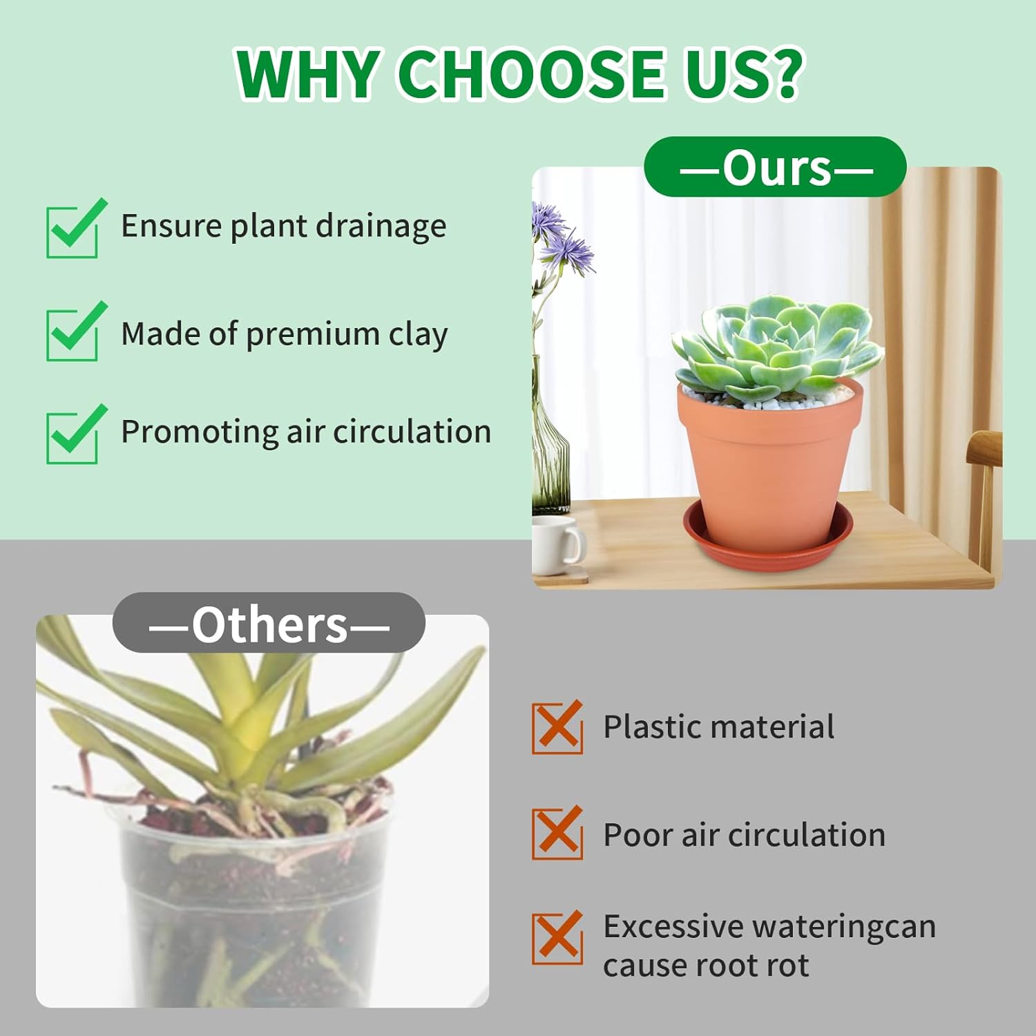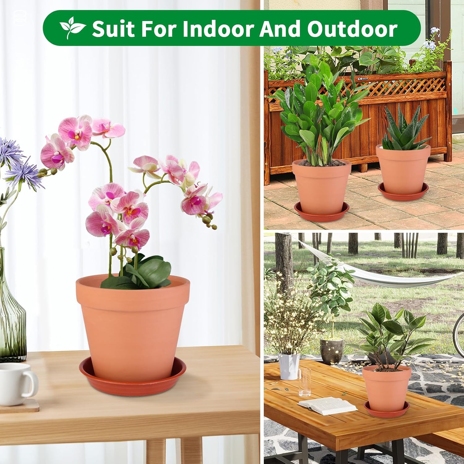 • 【Optimal Plant Health & Cleanliness】 6 inch porous clay pots promote superior airflow and drainage, preventing overwatering and root rot for healthier plants. Included meshes and saucers keep surfaces tidy by capturing excess water and soil.