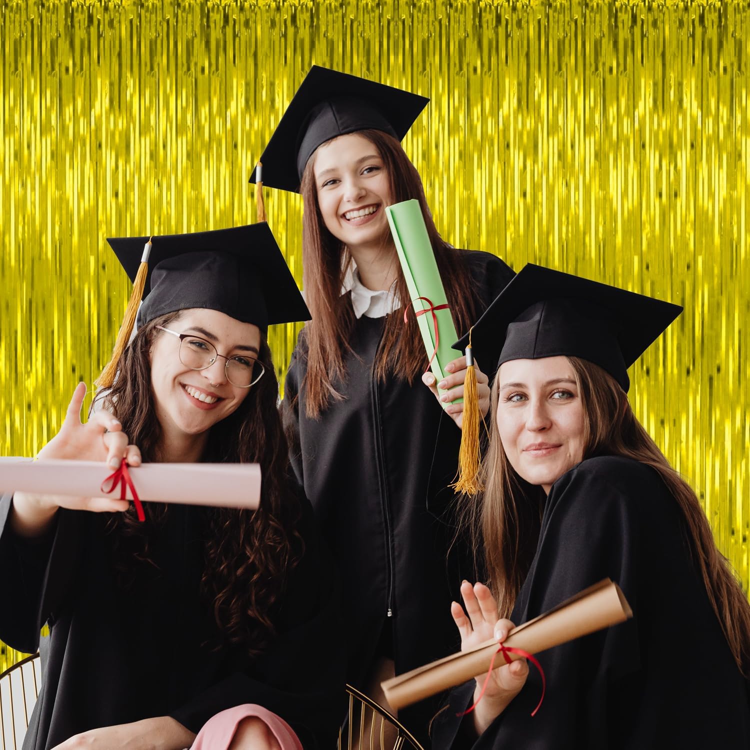 • Graduation Decorations:3 packs of foil fringe curtains,the size of the foil curtain is 3.28 ft x 6.56 ft.It's long enough to fit any occasion.Please do not stick the foil curtain on uneven or stained walls to prevent it from falling off.