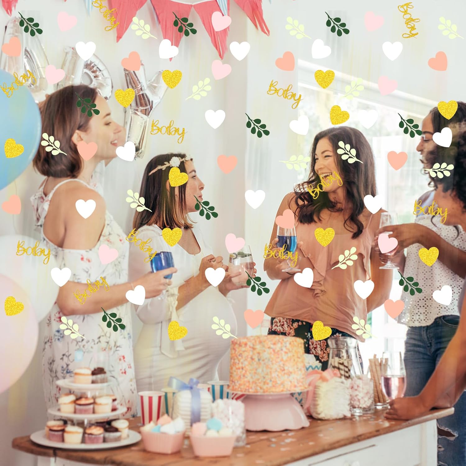 • 1.The baby girl baby shower decorations confetti package include:200pcs total,there are 3designs heart sage leaves and “baby” letters in 6 colors(shiny gold/light green/dark green/white/blush pink/peach pink),looks warm and full of vigor.