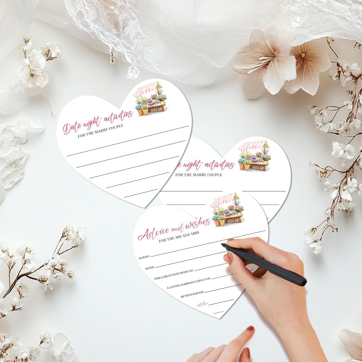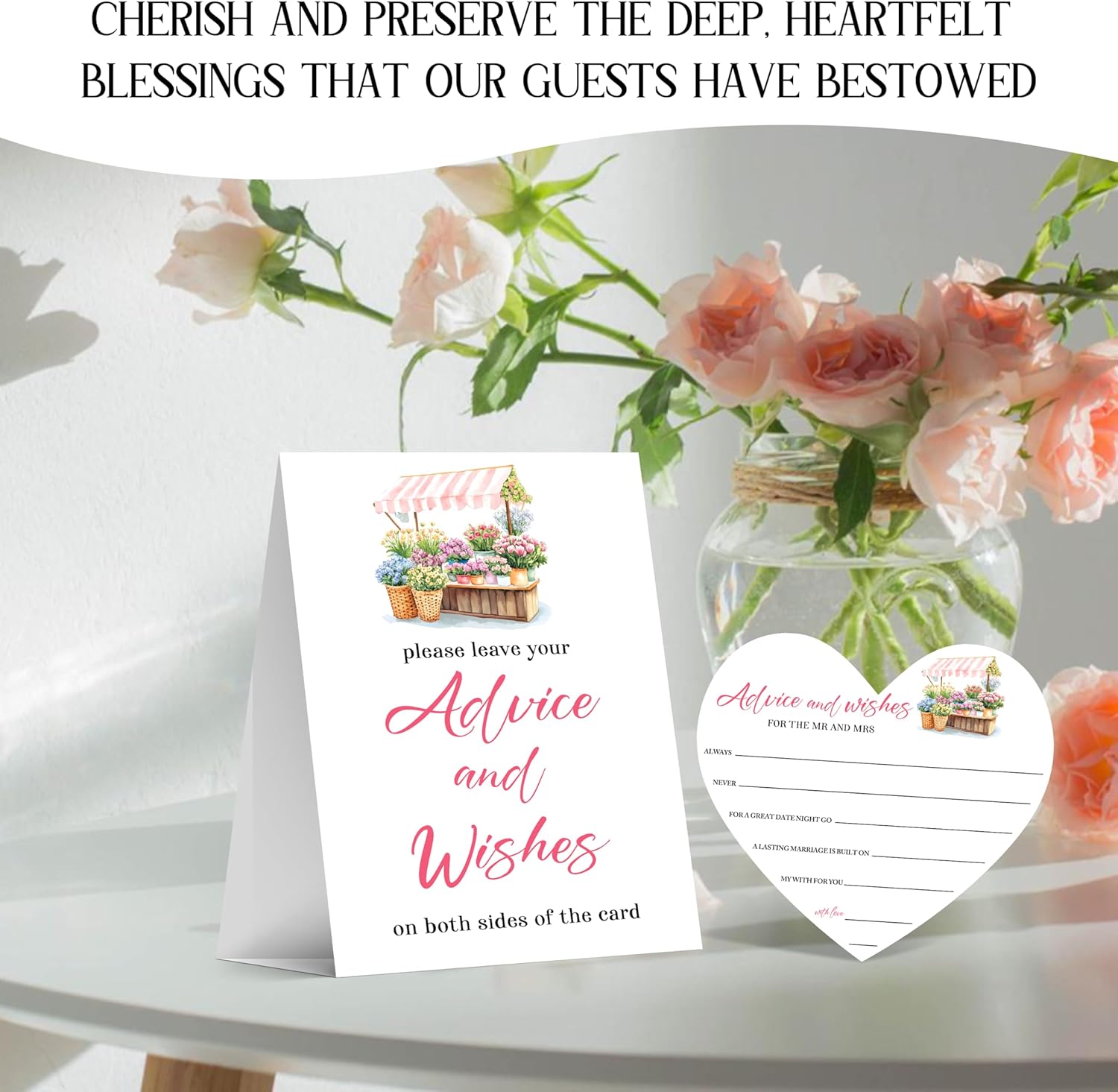 • Applicable specifications: Comes with 25 5.3x5.9 inch double-sided heart-shaped wishes cards. On one side, there are "advice and wishes" written, while on the other side, there are "date night activities" written. It also includes a 5x7 paper standing sign to guide guests, making it an ideal choice for wedding decoration and bridal showers