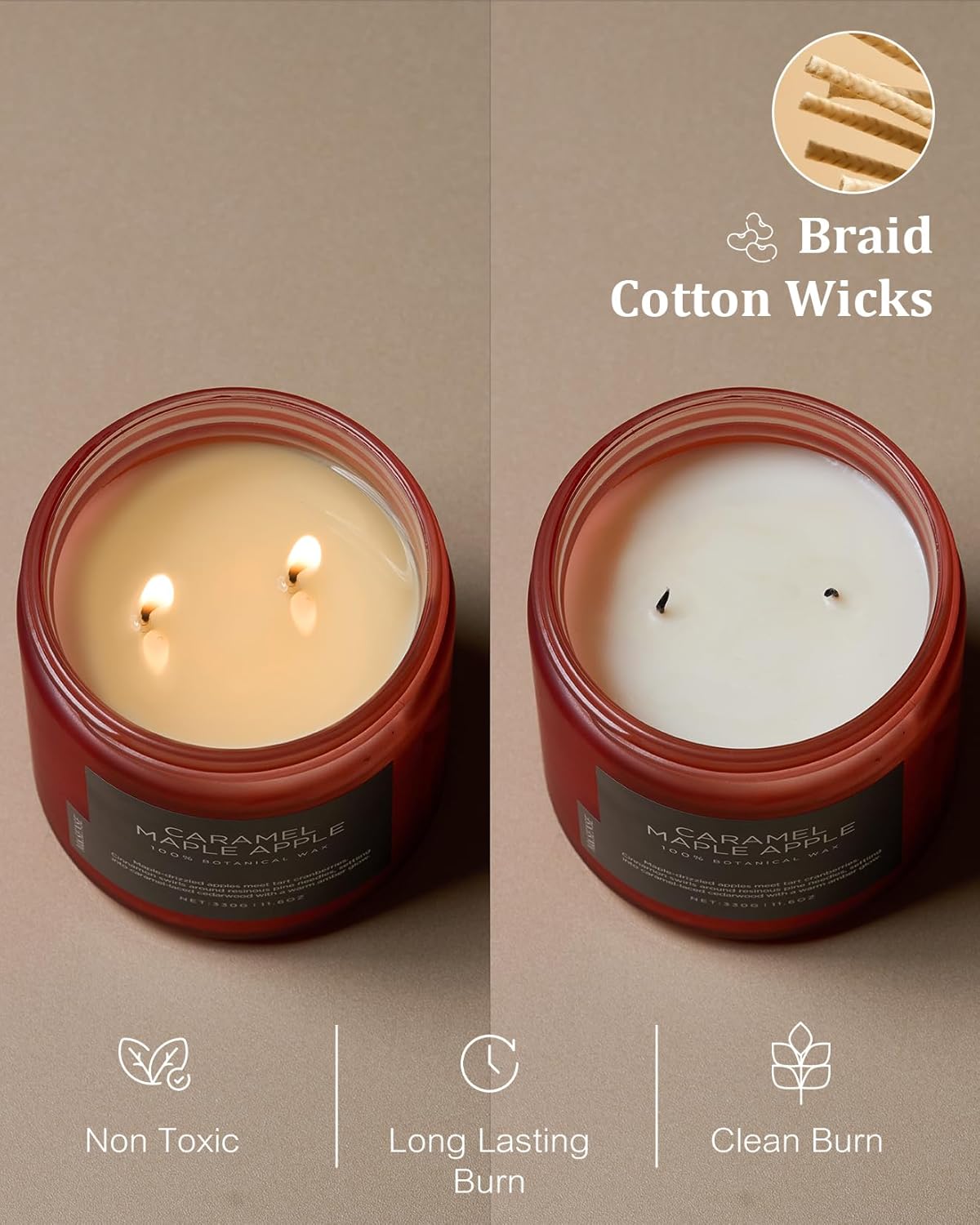 • Clean Consistent & Even Burn - Using 2 American made lead-free cotton wicks for a even burn result. They're cotton flat braid wicks with paper throughout, providing increased rigidity and burn more consistently than 100% cotton wicks. Designed to reduce carbon buildup which leads to black soot