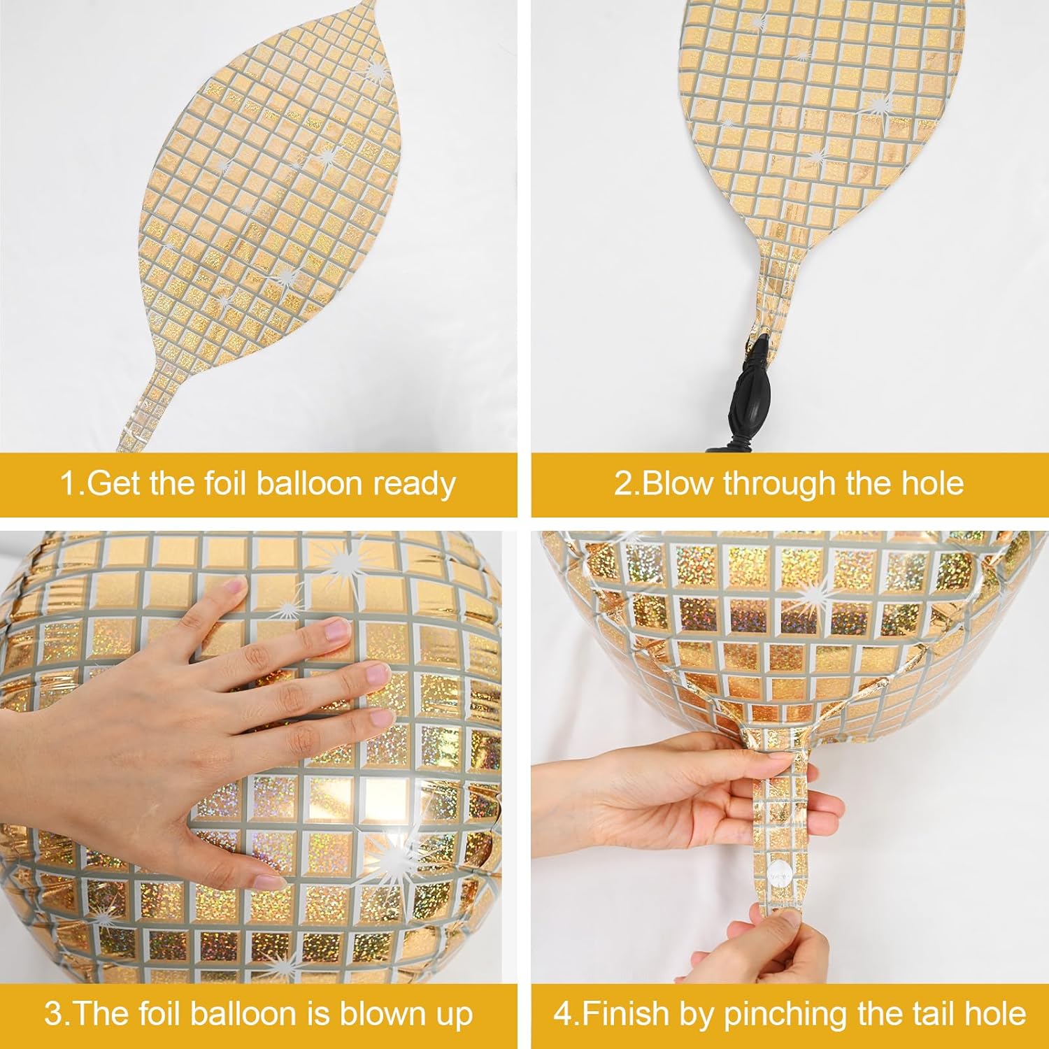 • EASY TO USE:These gold disco ball decorations balloons can be filled with air or helium.pinch the inflation port of the disco balloon to seal it.the set comes with a straw and ribbon,after the party is over,use the straw to deflate by inserting it into the inflation port,balloons can be reused