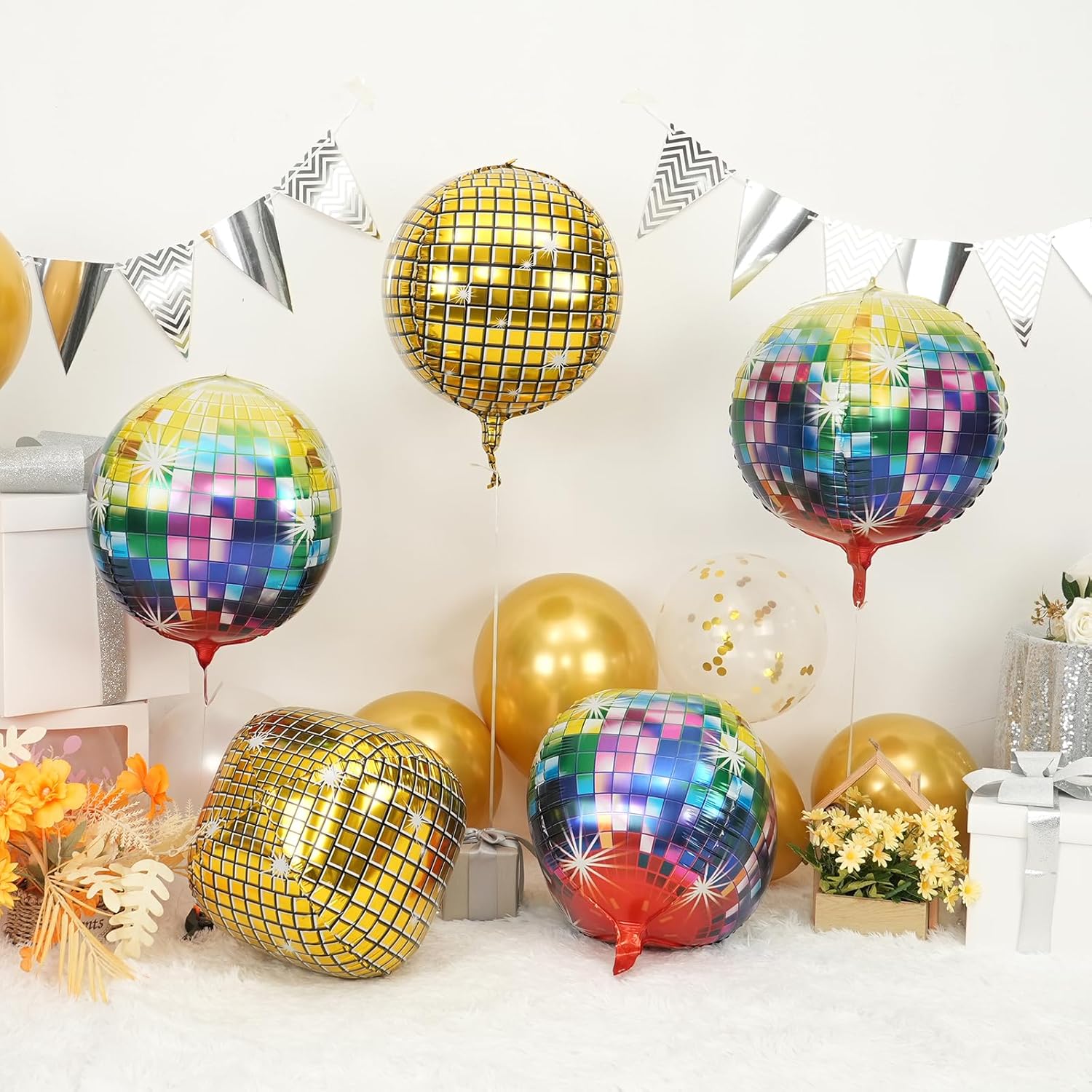 • MATERIAL:Our 22inch gold giant 4d disco ball balloons are with neat edges,not easy to explode and leak,non-toxic,with vibrant colours,Combine them with complementary dΓ©cor for an eye-catching setup.