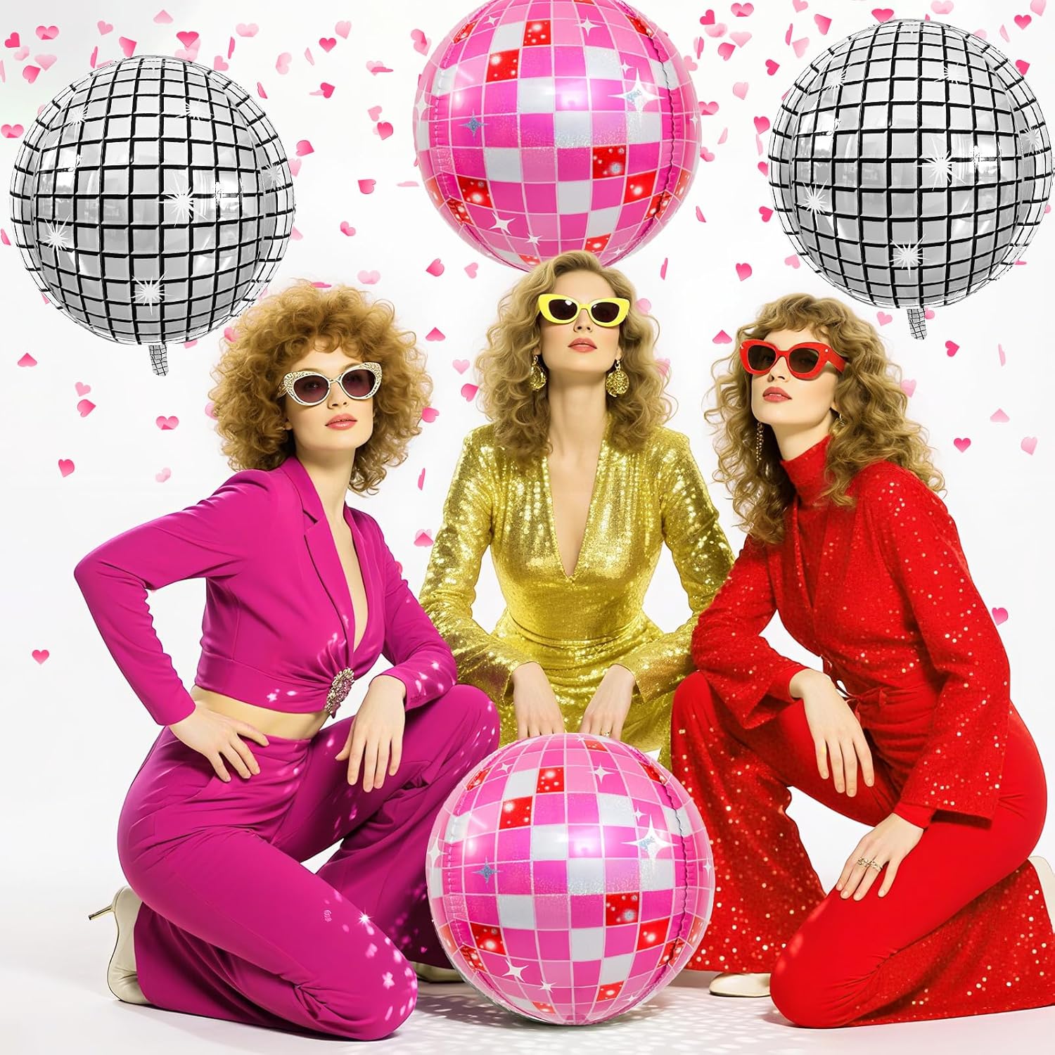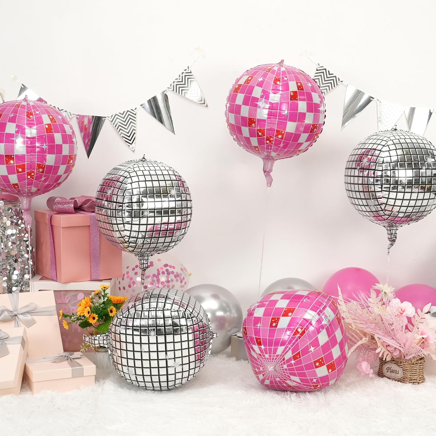 Disco Ball Balloons Pink Silver 4PC,Foil Disco Balloons 22 Inch 4D Round Pink Silver Balloon for 70s 80s Birthday Bachelorette Graduation Decorations