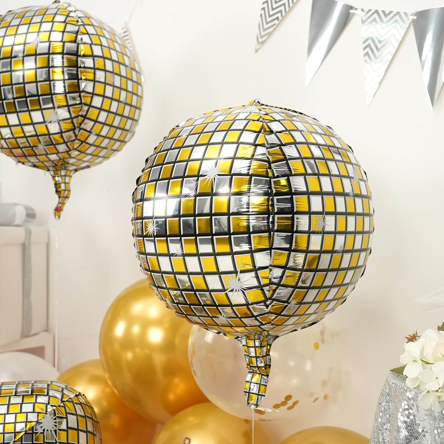 • MATERIAL:Our 22inch gold silver giant 4d disco ball balloons are with neat edges,not easy to explode and leak,non-toxic,with vibrant colours,Combine them with complementary décor for an eye-catching setup.