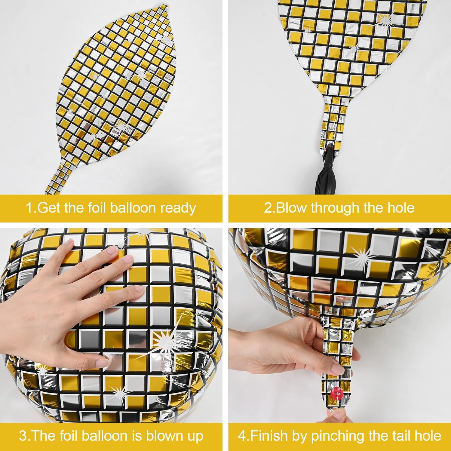 • EASY TO USE:These gold silver disco ball decorations balloons can be filled with air or helium.pinch the inflation port of the disco balloon to seal it.the set comes with a straw and ribbon,after the party is over,use the straw to deflate by inserting it into the inflation port,balloons can be reused