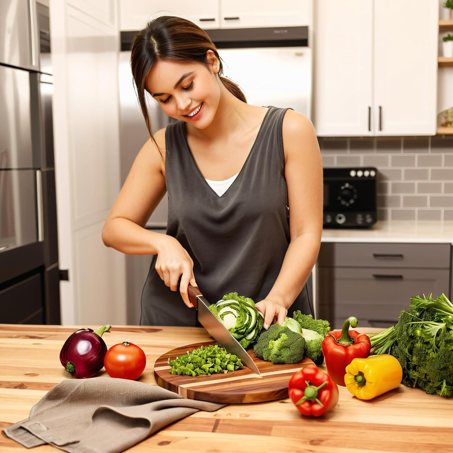• Three Shapes in One Set: Each package includes a round(12"/30cm) a rectangular(12"x8.26"/30x21cm) and a semicircular(12"x8.85"/30x22.5cm) wood cutting board, each equipped with a handle. Whether you're chopping veggies, cutting meat, or serving cheese, these shapes cater to a wide range of culinary needs.