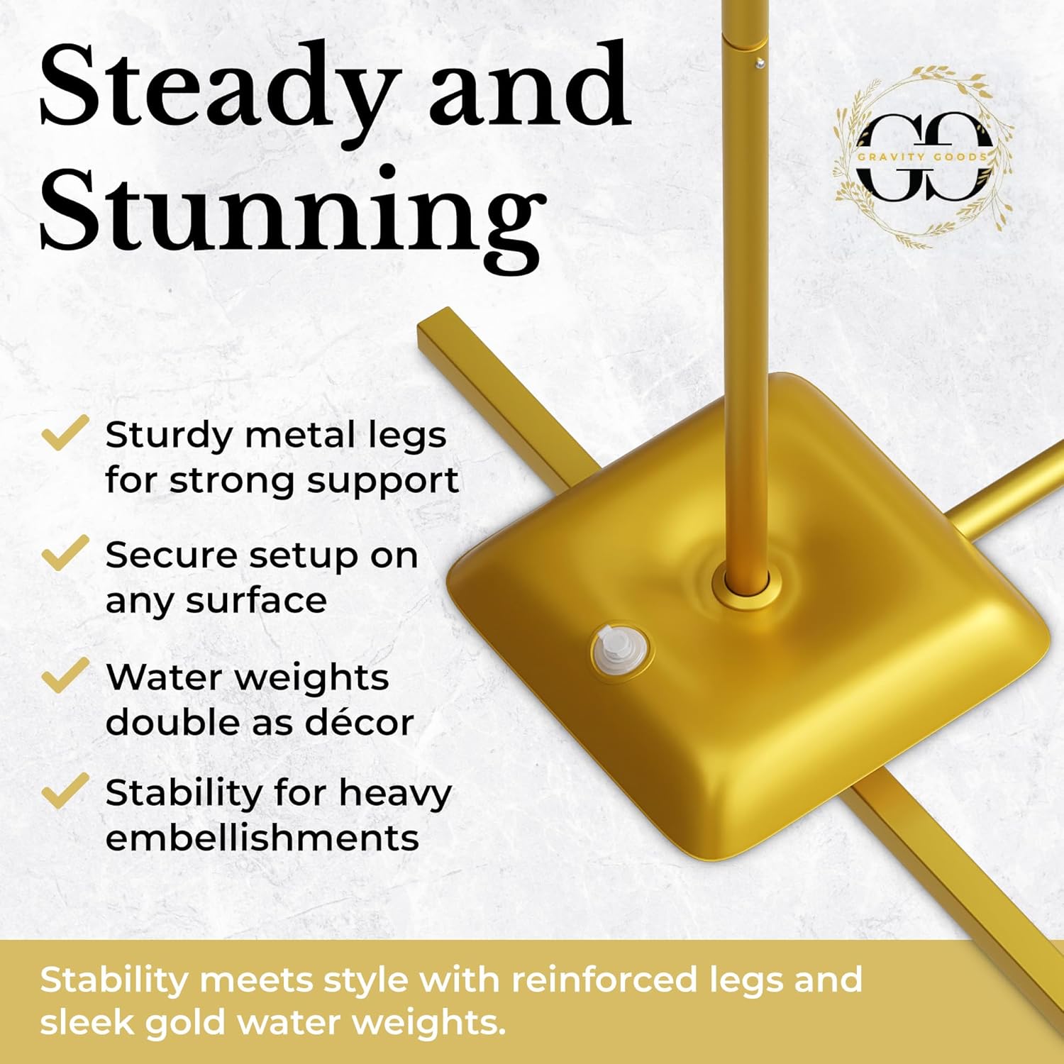 • STAY FOCUSED ON CELEBRATIONS & not on a wobbly backdrop stand for parties. The 2 gold water weights hold it steady during outdoor gusts or indoor setups. With a gold finish, there's no need to search for weights that match your elegant design