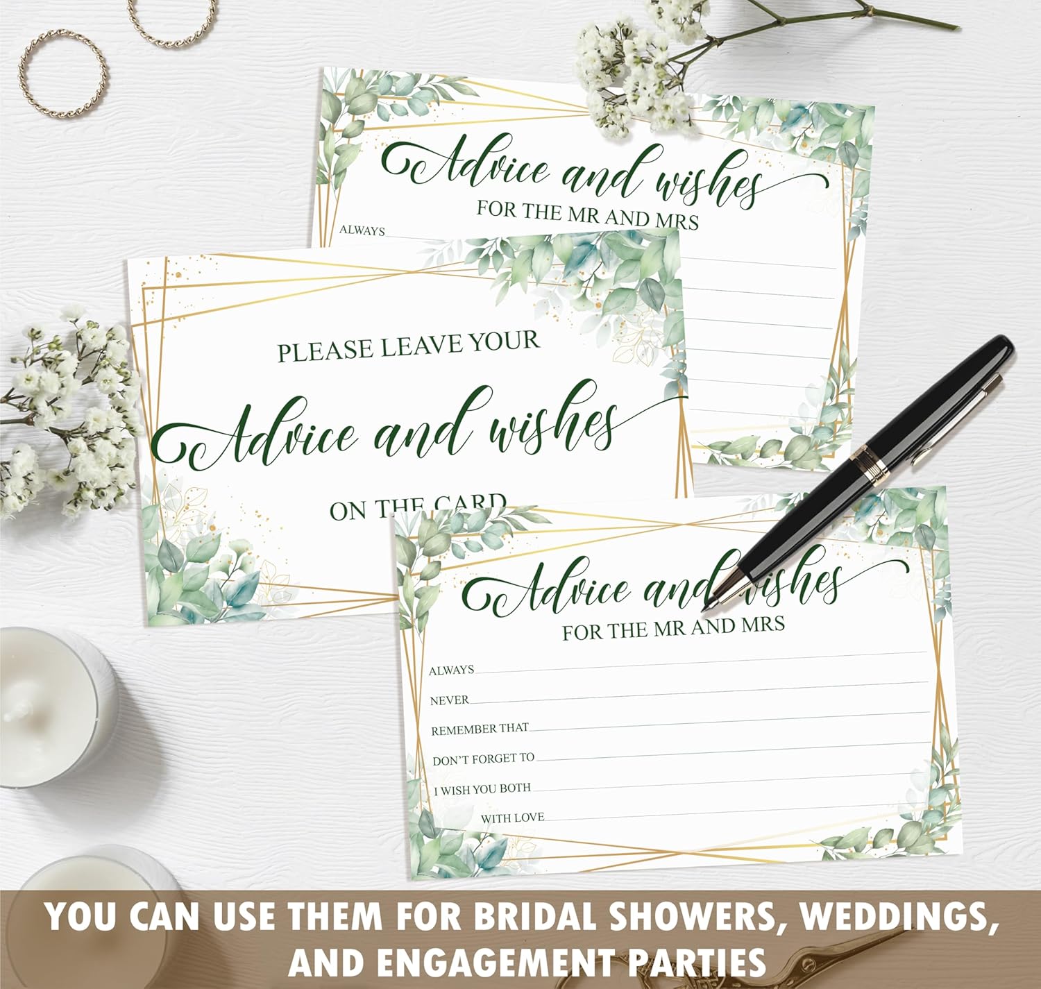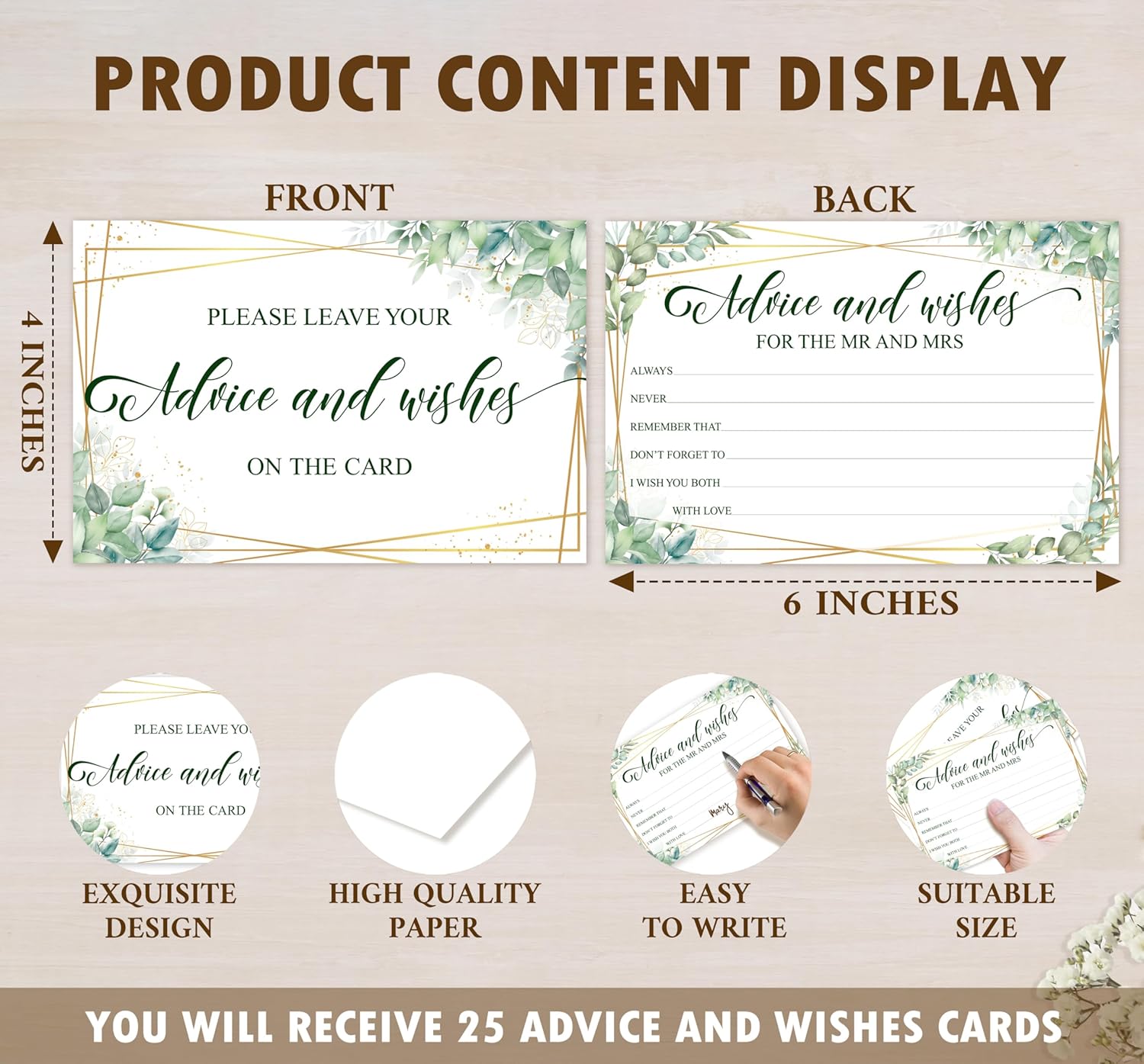 Advice And Wishes Cards For the Mr & Mrs, Gold Foil Greenery Wedding Advice Card For Bride Groom Newlyweds, 25 Wishes Cards for Wedding Bridal Shower Engagement Party, 01