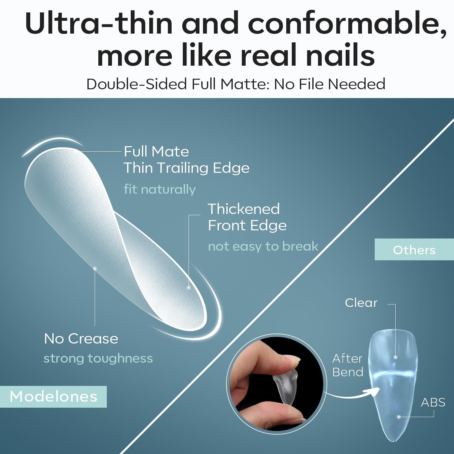 • Stronger Adhesion & Natural Nail Feeling: Modelones upgraded fully frosted texture for increased friction, which makes our soft nail gel tips feature stronger adhesion and a better fit on your nails. With high-quality soft nail gel material, strong toughness and malleability, thin and light with a thin back edge that fits perfectly on the cuticle of your fingers and a thick front edge that is very strong and resistant to breakage and no folding marks, more like natural nails
