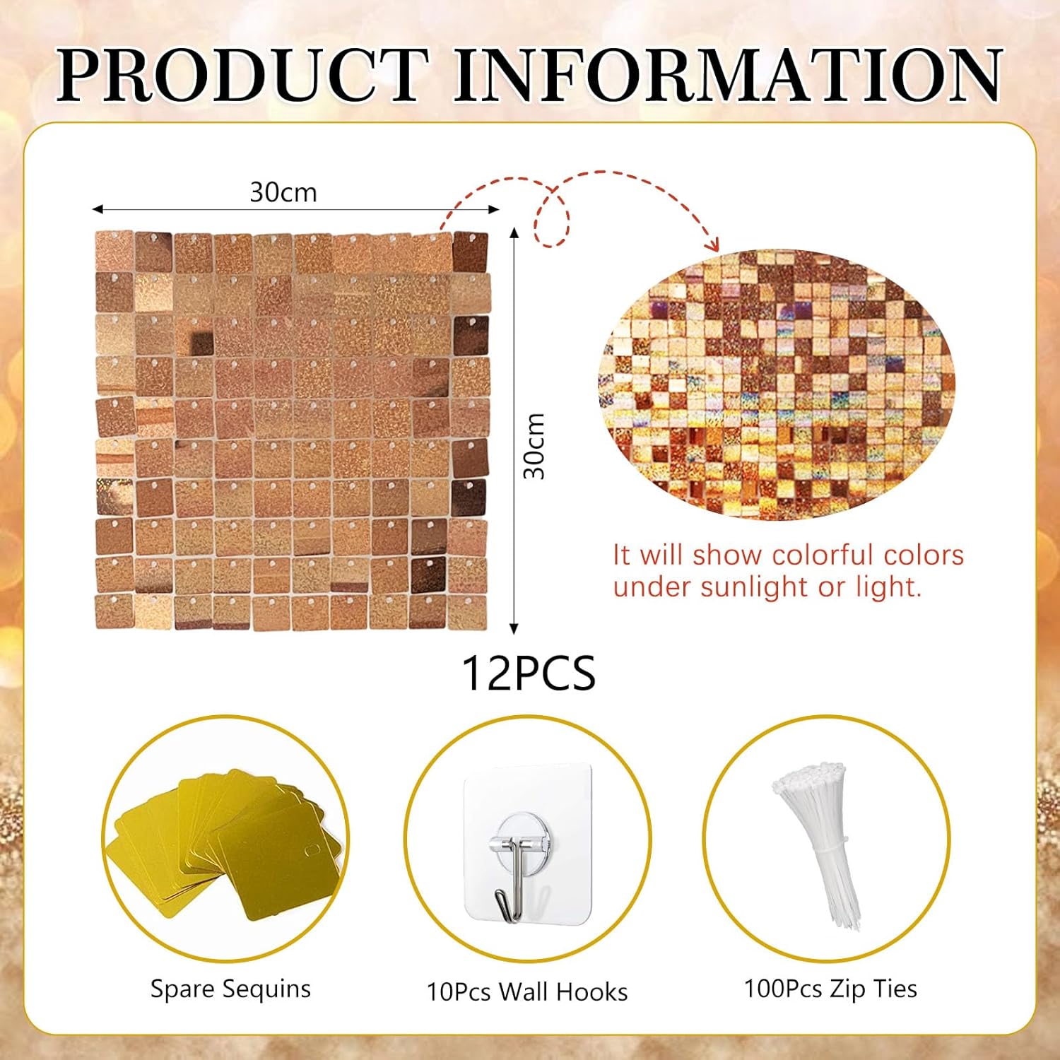 • 【Package Includes】Each box includes 12 champagne laser sequin wall panels (12"x 12" each). We provide enough zip ties (100 pcs), a pack of spare sequins, and wall hooks (10 pcs) to support the weight of the wind panel, as well as an installation manual. 12pcs can cover 3x4ft place. More boxs will cover a larger area and have a fuller look.