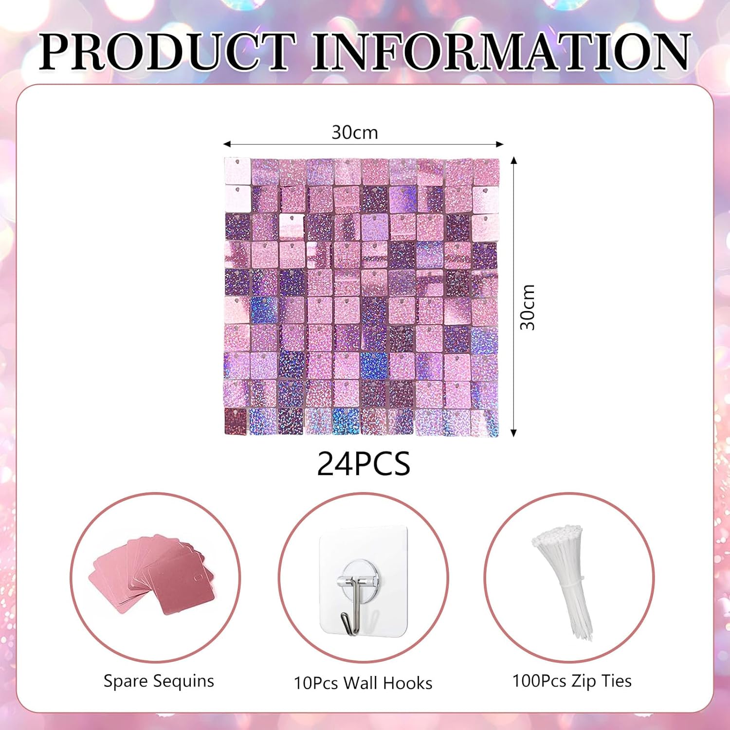 • 【Package Includes】Each box includes 24 light pink laser sequin wall panels (12"x 12" each). We provide enough zip ties (100 pcs), a pack of spare sequins, and wall hooks (10 pcs) to support the weight of the wind panel, as well as an installation manual. 24pcs can cover 4x6ft place. More boxs will cover a larger area and have a fuller look.