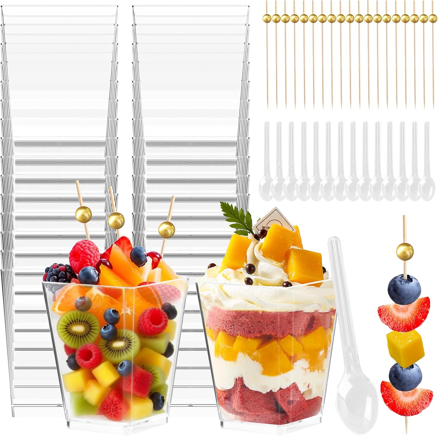 Kosotody 150 Pcs 5 OZ Dessert Cups with Spoons Cocktail Picks, Square Appetizer Cups Clear Mini Mini Party Serving Cups for Party Appetizers Pudding Yogurt Ice Cream Fruit