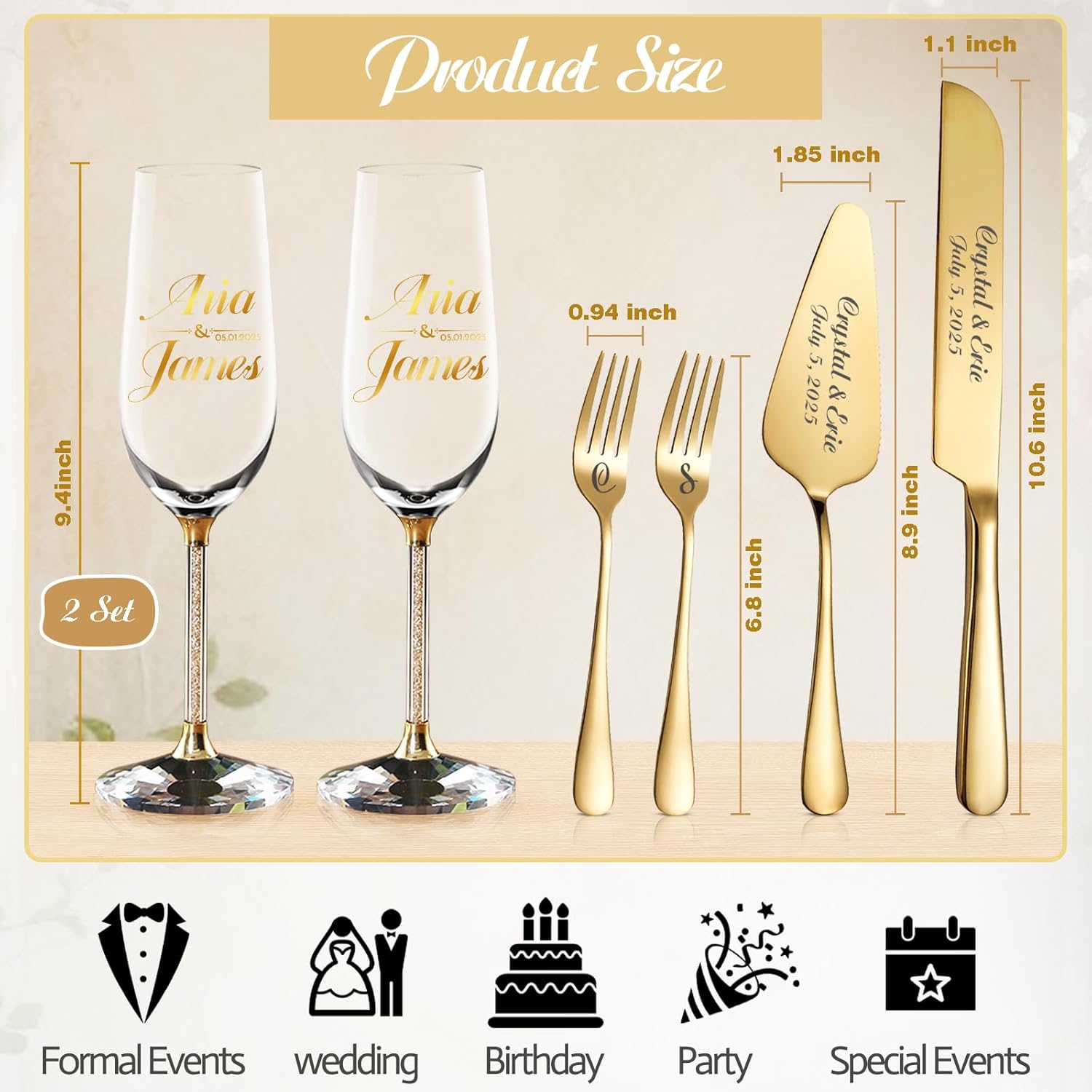 • Premium Craftsmanship & Durability:The cake knife and server set is rust-proof and built to last, while the champagne flutes are lead-free and resistant to chipping. Both sets undergo strict quality checks, ensuring years of use as wedding keepsakes
