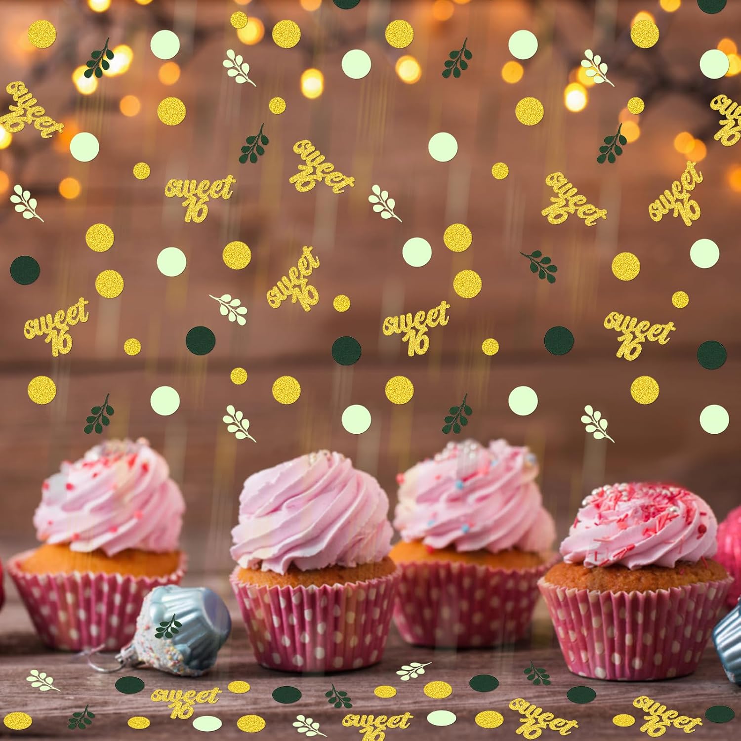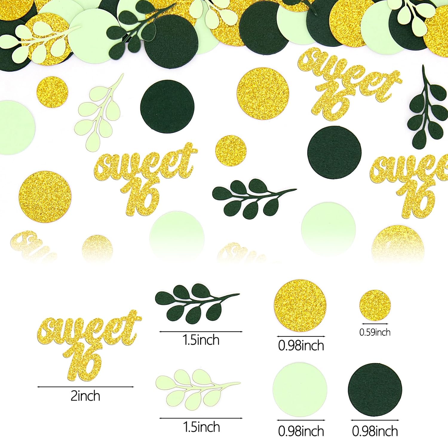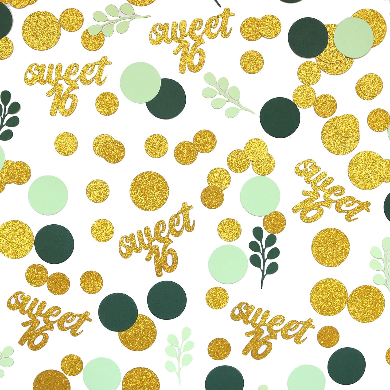 • 1.Great Addition to Sweet 16 Party.The green and gold circle dots with sweet 16 confetti scatter are shiny and fresh,very sparkle,a perfect addition to 16th birthday theme,nice green nature neutral boy/girls 16th birthday decorations.